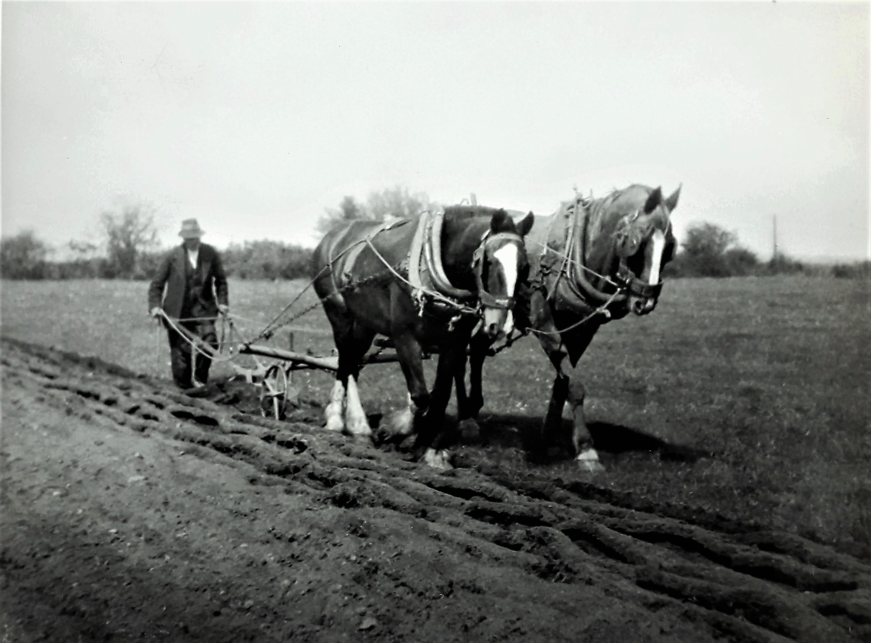 An image of a farmer using a horse-drawn plough in rural Ireland.