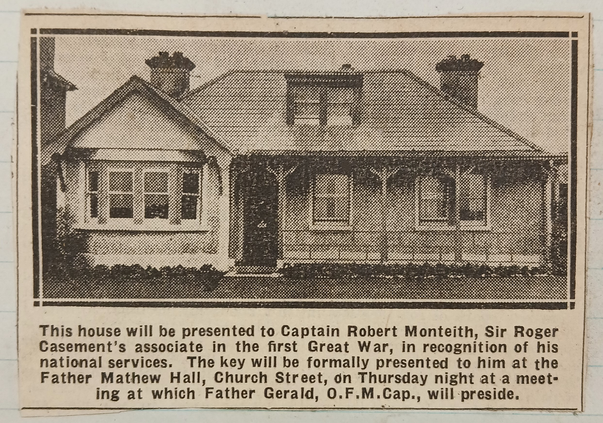 A clipping of a photograph of the house presented to Captain Robert Monteith and his wife ‘in recognition of his national services’. The clipping is taken from the ‘Evening Mail’ (15 March 1949).