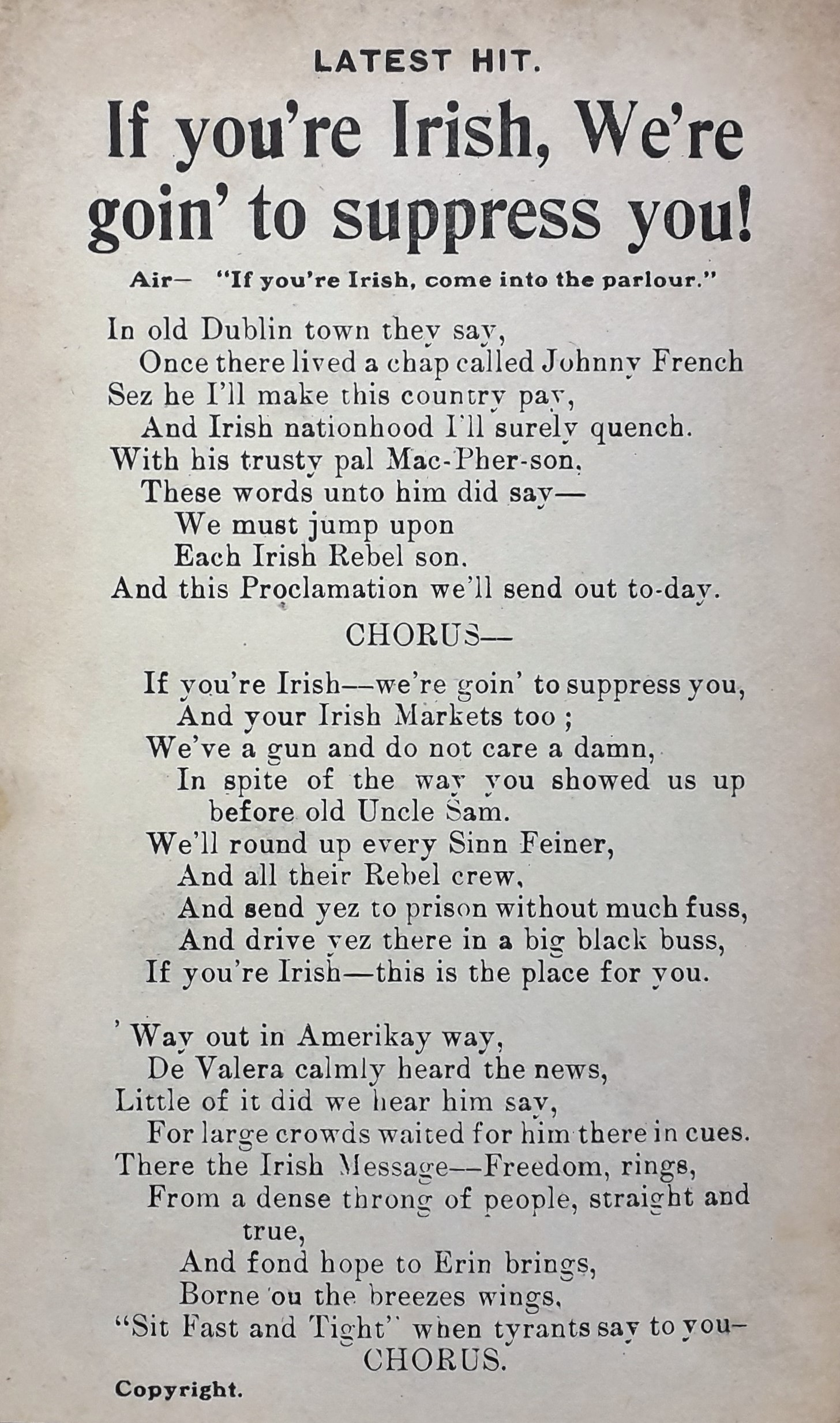 A flier with the text of a republican ballad titled ‘If you're Irish, We're going to suppress you!’