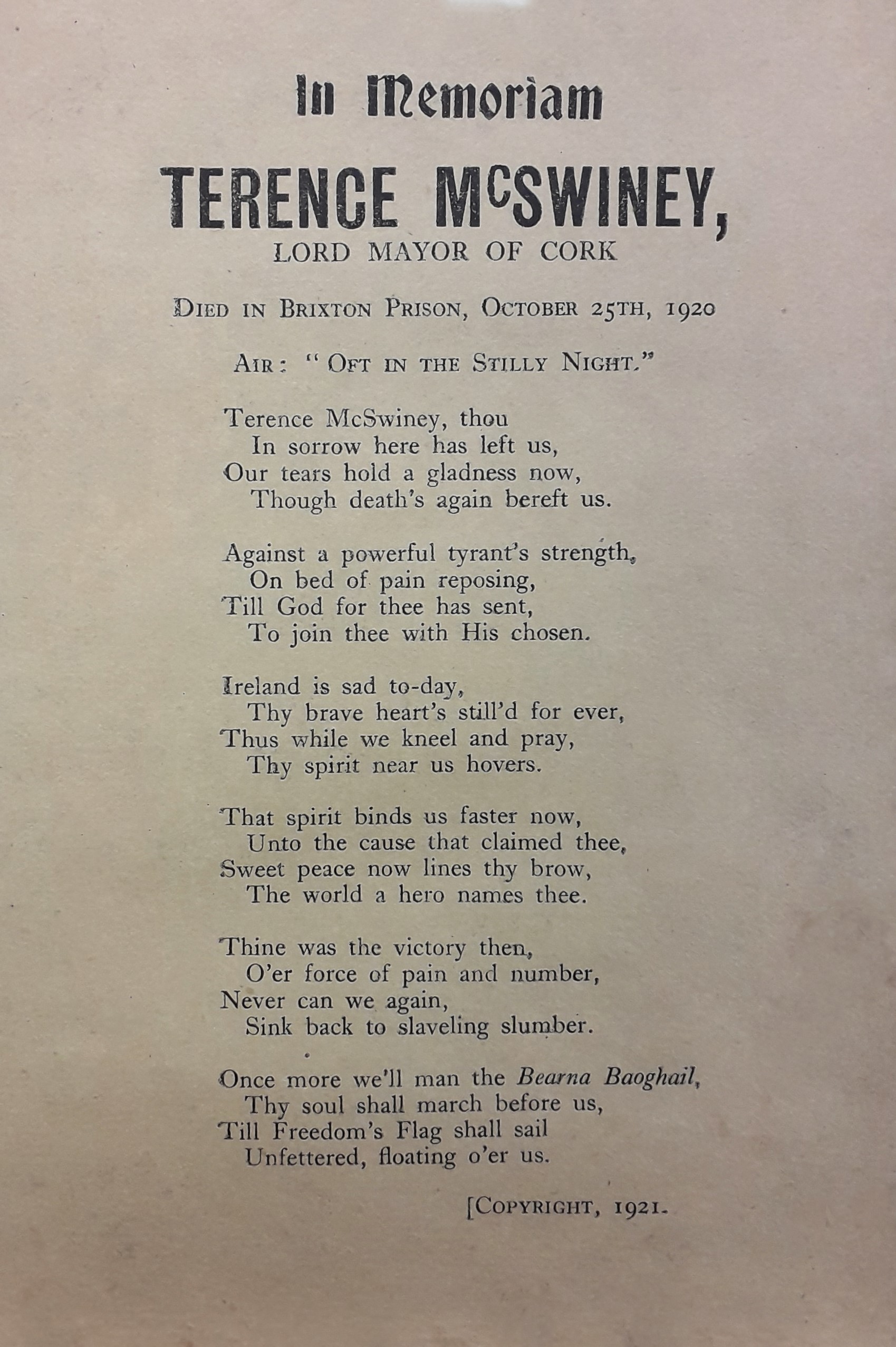 A flier with the text of a ballad memorializing Terence MacSwiney, Lord Mayor of Cork.