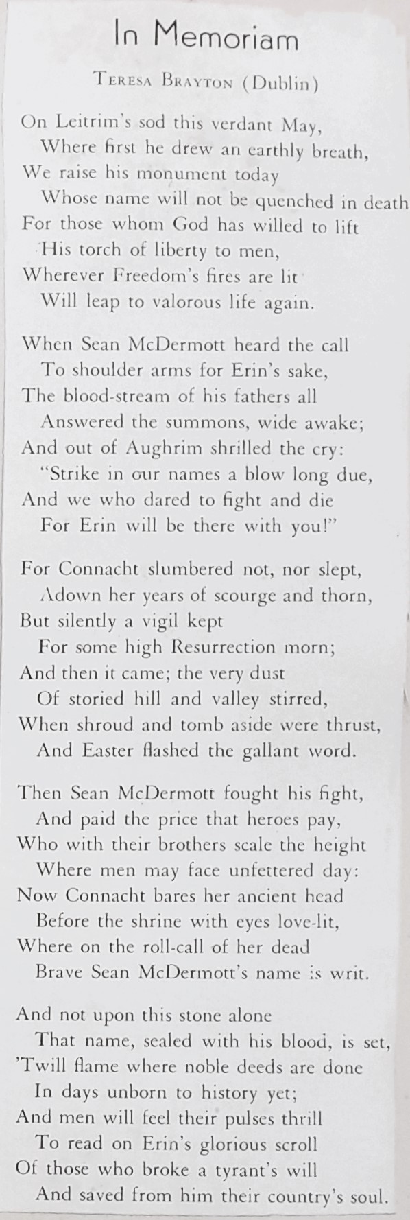 A clipping of a memoriam poem to Teresa Brayton. (Volume page 103).
