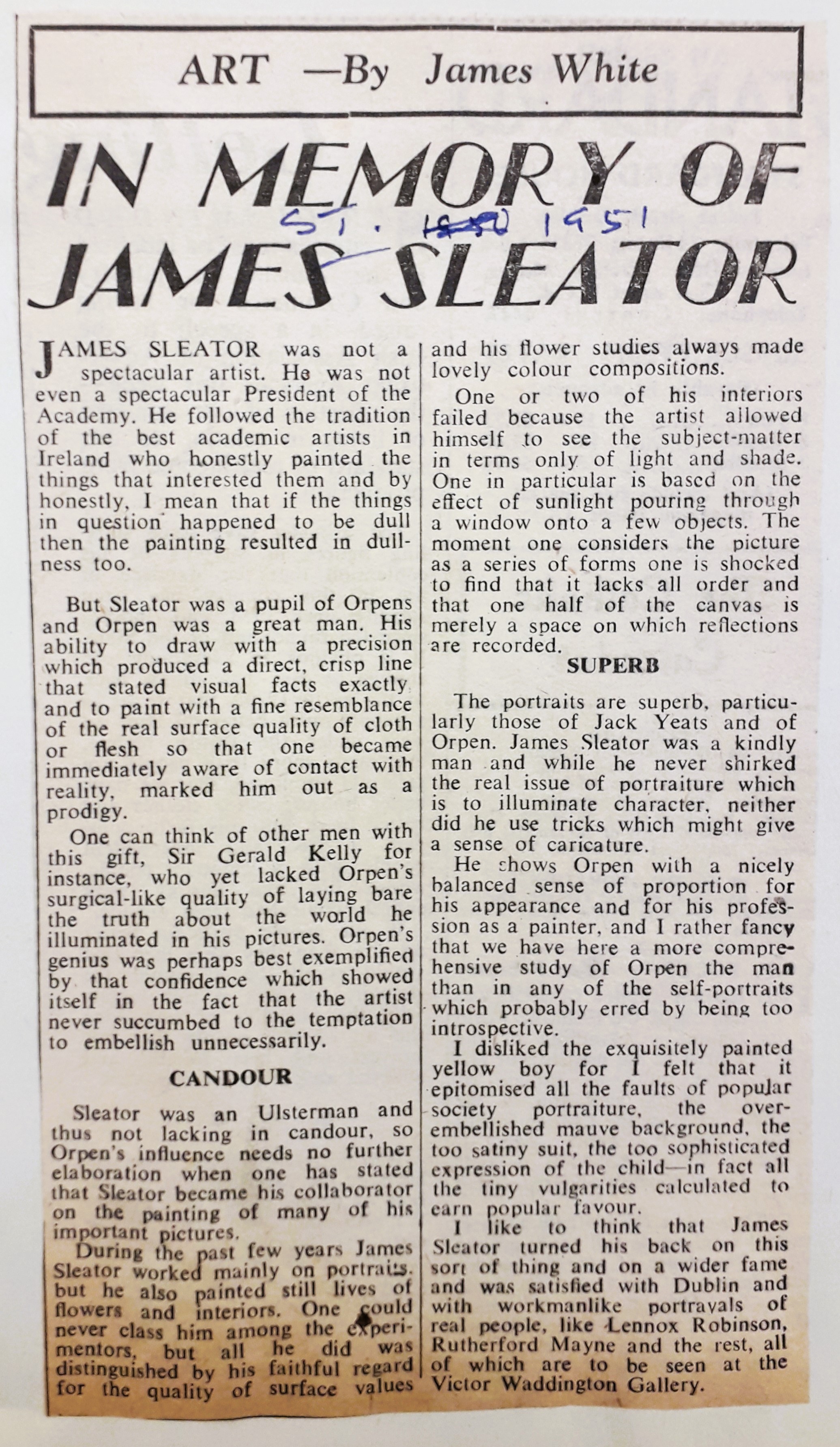 A clipping of an appreciation by James White of the Ulster-born artist James Sleator.