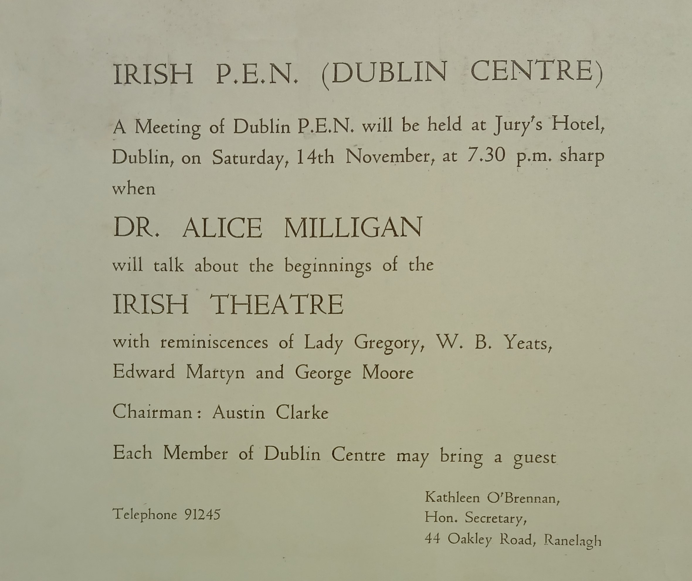 An invitation card to a lecture by Alice Milligan on the origins of Irish Theatre in Jury’s Hotel in Dublin organised by Irish Pen. It is noted that Kathleen O’Brennan is honorary secretary of Irish Pen.