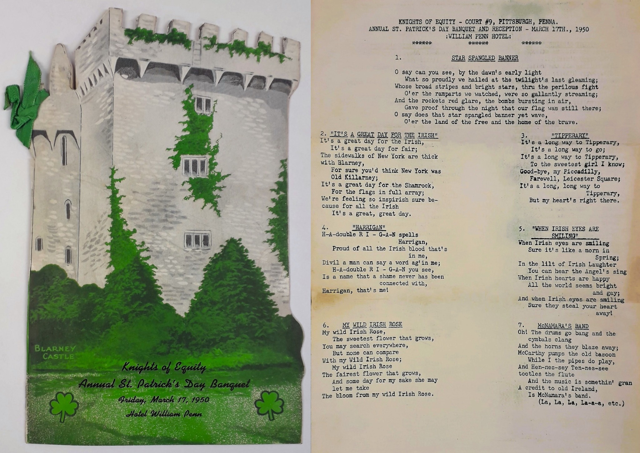 An invitation to a banquet organised by the Knights of Equity, an Irish Catholic fraternal organization, in Pittsburgh, Pennsylvania, on 17 March 1950. The card shows Blarney Castle, a fifteenth-century tower house, in County Cork. The festivities organised by the Knights of Equity included the singing of popular Irish songs such as ‘It’s a great day for the Irish’ and ‘When Irish eyes are smiling’.