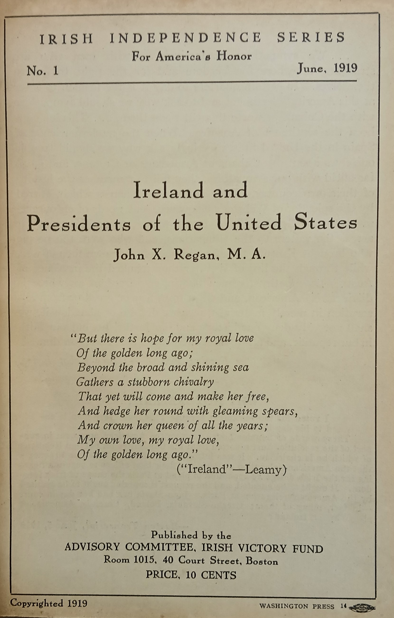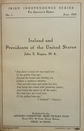 A pamphlet by John X. Regan referring to the need for American support for a solution to the Irish Question. Published in Boston (Mass.) by the Advisory Committee, Irish Victory Fund. Cover title. At head of title: ‘for America’s honor’, No. 1.