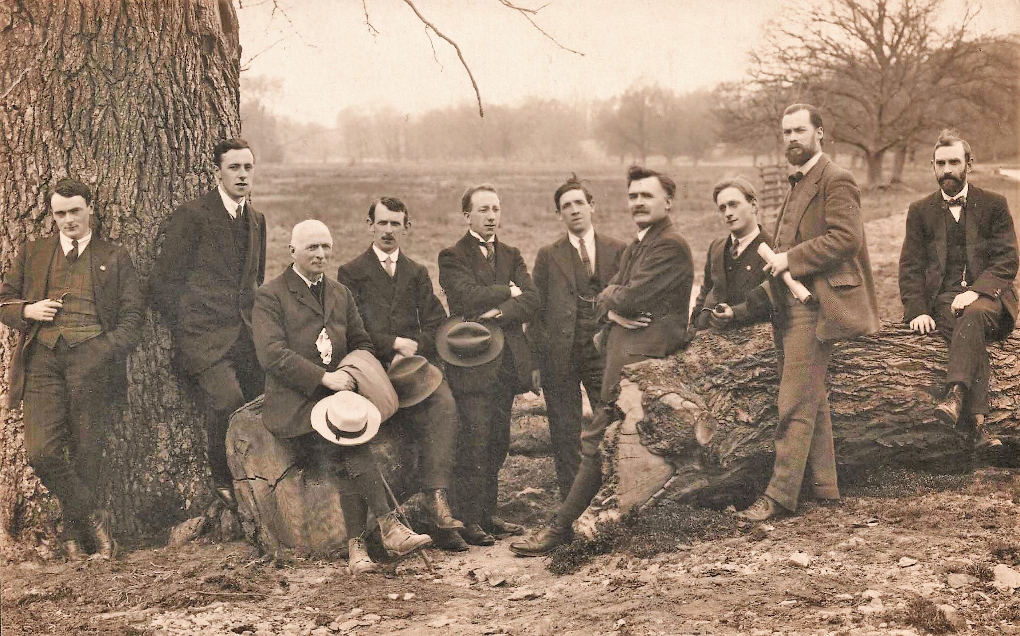 Photographic print of Irish Republican prisoners at Fairford, Gloucestershire. An annotation (in pencil) on the reverse reads: ‘(left to right) Frank McCabe, Peter Healy (dead), Joe Mac Bride, Seán T. Ó Ceallaigh, Liam Peadar, Sceilg [John Joseph O’Kelly], Barney Mellows, Darrell Figgis, Dr. McCartan … Deportees at Fairford’.