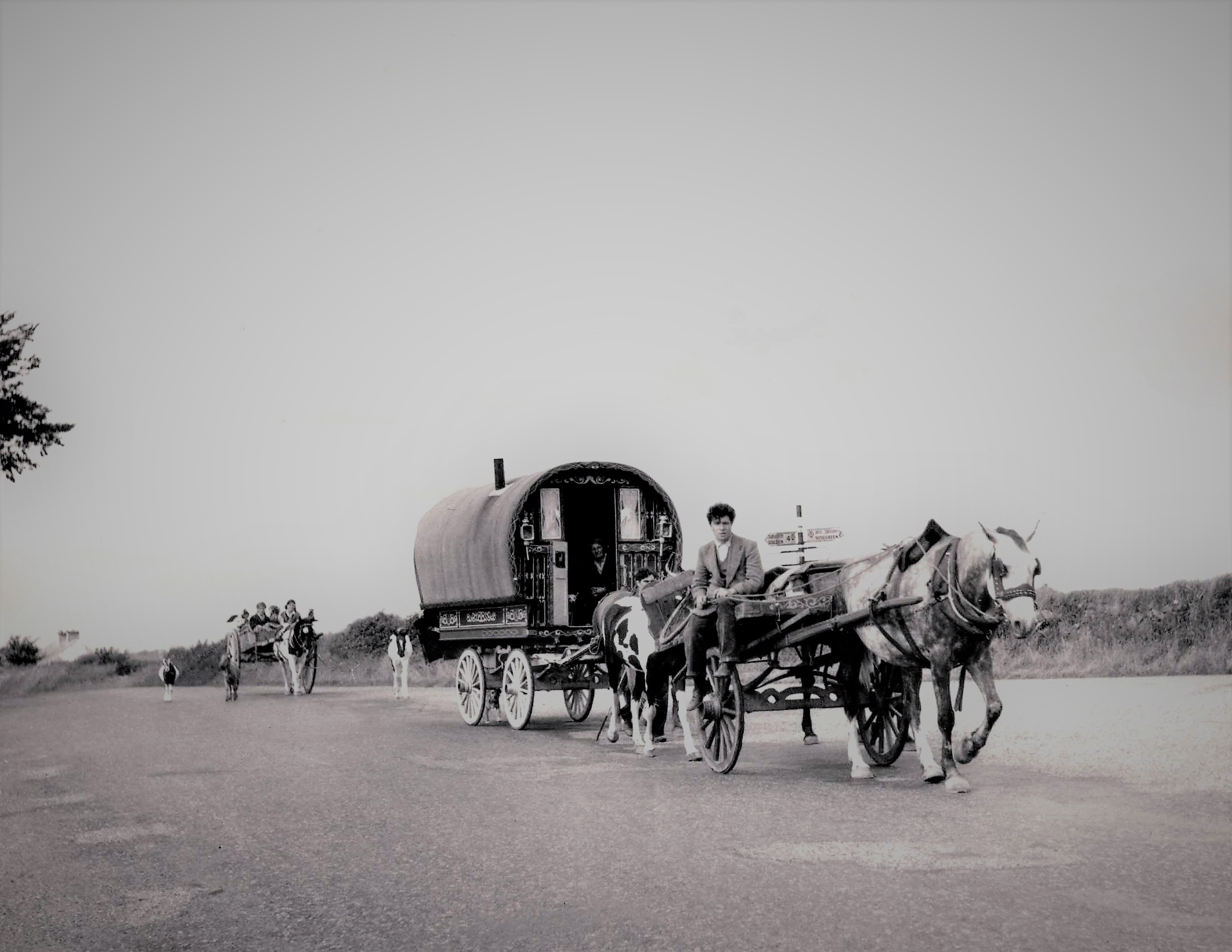 A view of a group of Irish travellers in a traditional horse-drawn caravan on a country road.
