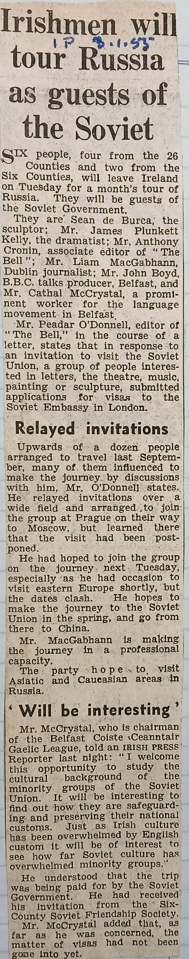 A clipping of an article reporting on the impending trip of six Irish men to the Soviet Union. The group included the dramatist James Plunkett and the Dublin journalist Liam MacGabhann. The clipping is taken from the ‘Irish Press’ (3 January 1955).