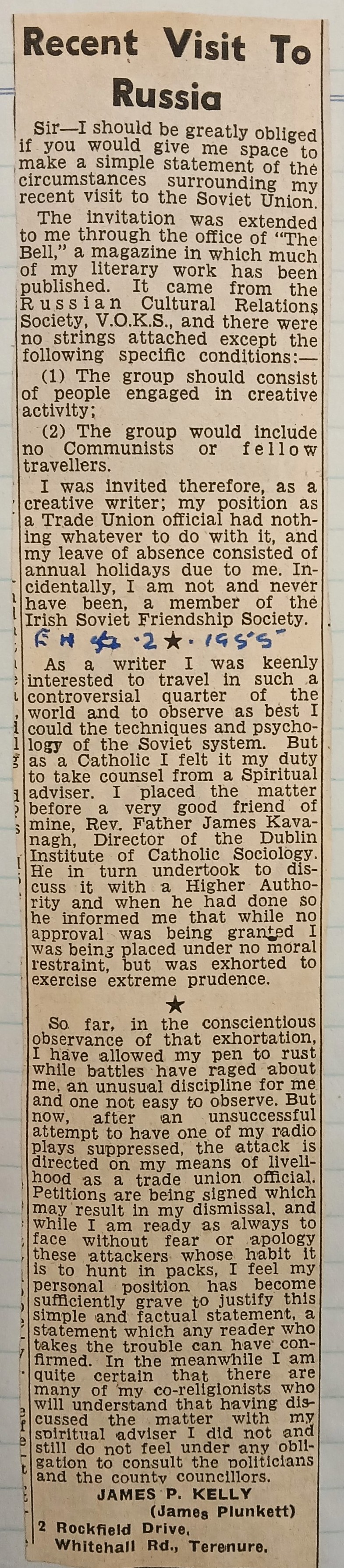 A clipping of a letter from James Plunkett defending his recent cultural visit to the Soviet Union. The travelling party included various Irish artists, writers and journalists. Plunkett maintains that the invitation to visit Russia was extended through the offices of ‘The Bell’ magazine which had previously published his work. The clipping is taken from the ‘Evening Mail’ (4 February 1955).