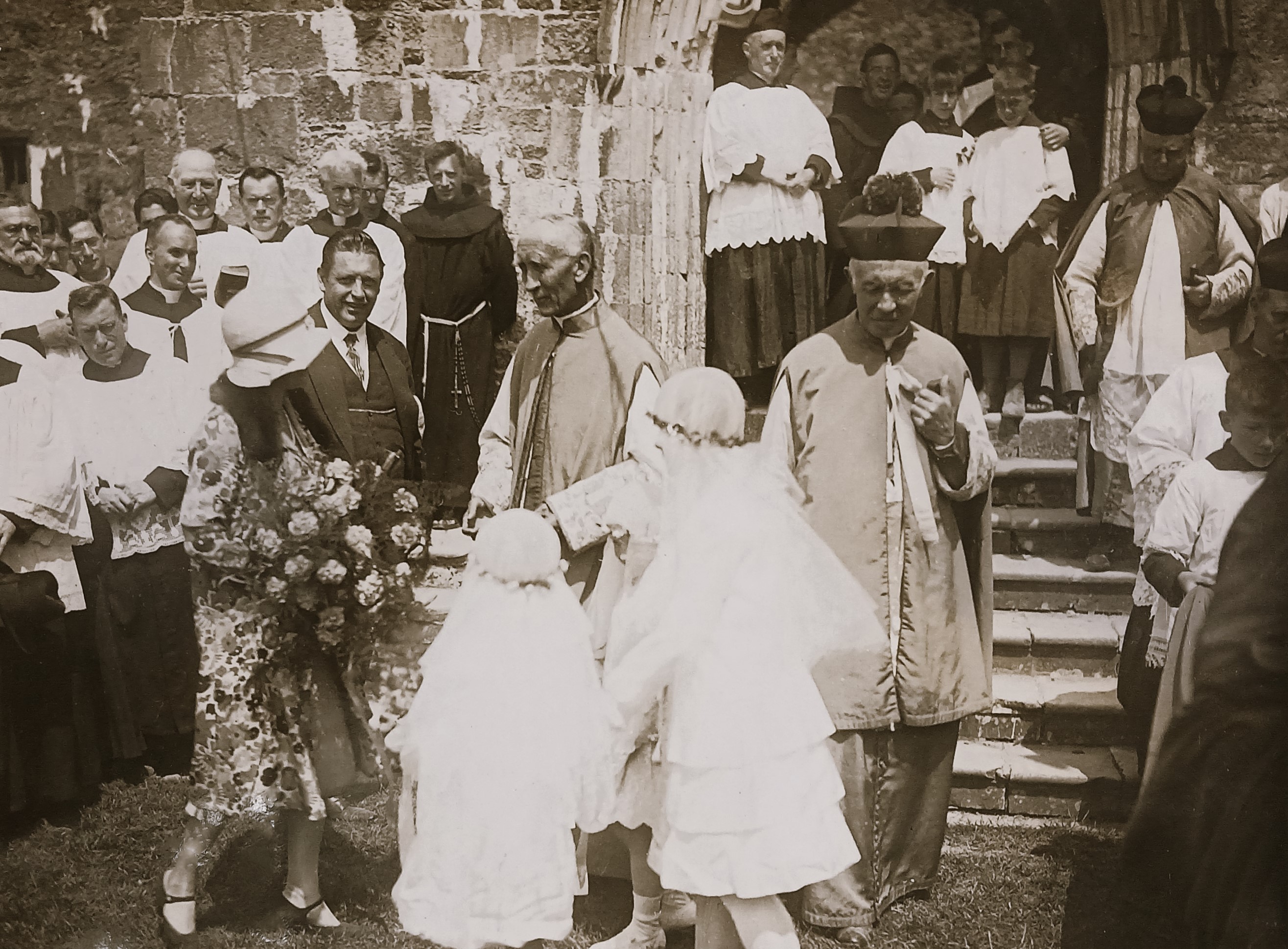 A photograph of John McCormack at a religious ceremony. The location is not stated but several Franciscan friars (OFM) are visible in the image.