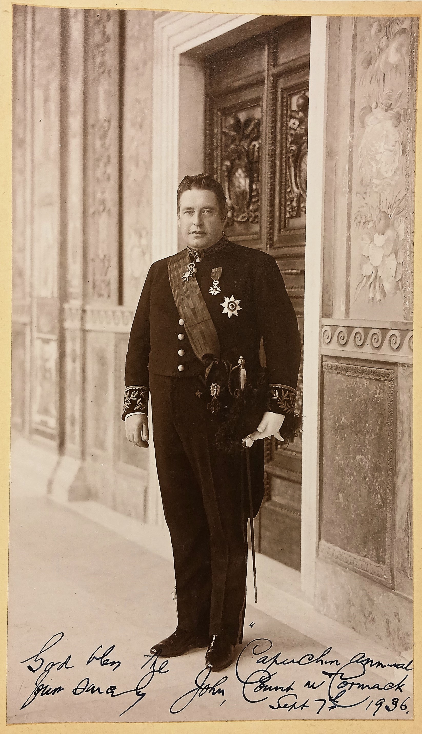 An image of John McCormack in the uniform of a Papal Count at the Vatican. The print is annotated and reads ‘God bless the Capuchin Annual’. It is signed by McCormack and dated 7 September 1936.