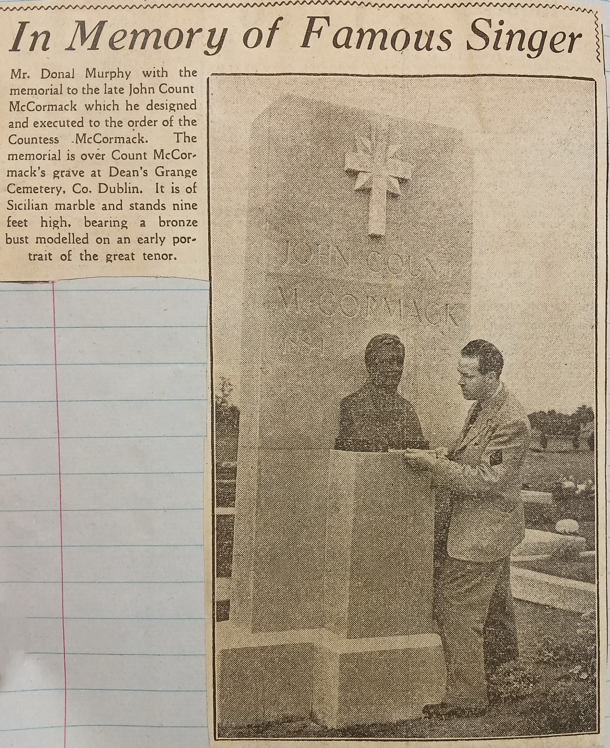 A clipping of a photograph of Donal Murphy working on the grave memorial of John McCormack in Dean’s Grange Cemetery in County Dublin. The clipping is taken from the ‘Sunday Independent’ (29 October 1950).