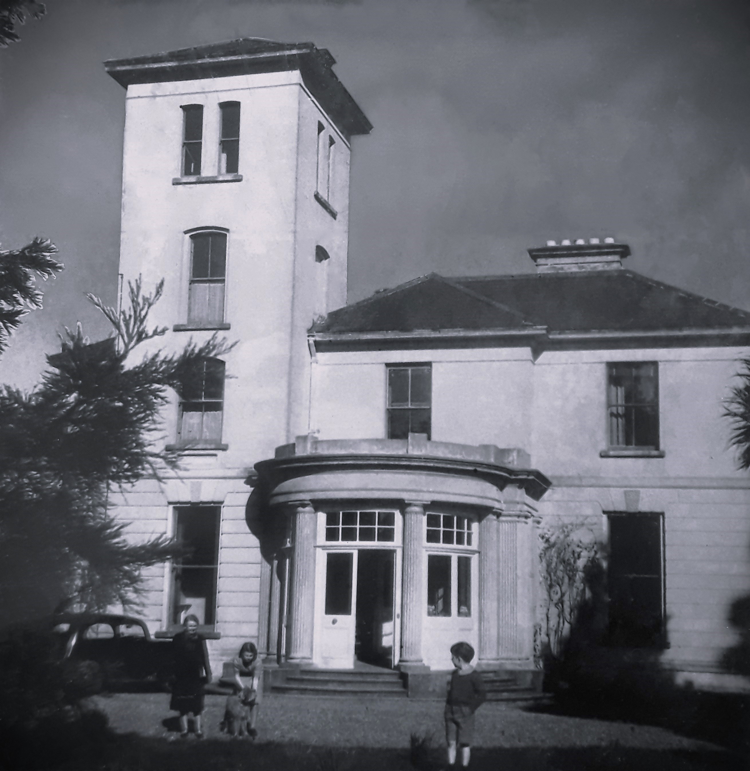 A photographic print of Kindlestown House in Delgany, County Wicklow. The house was the residence of Dr James Ryan (1892-1970), a revolutionary, and later long-serving government minister. The image probably shows his wife Máirín Ryan, née Cregan (1891-1975), and their children.
