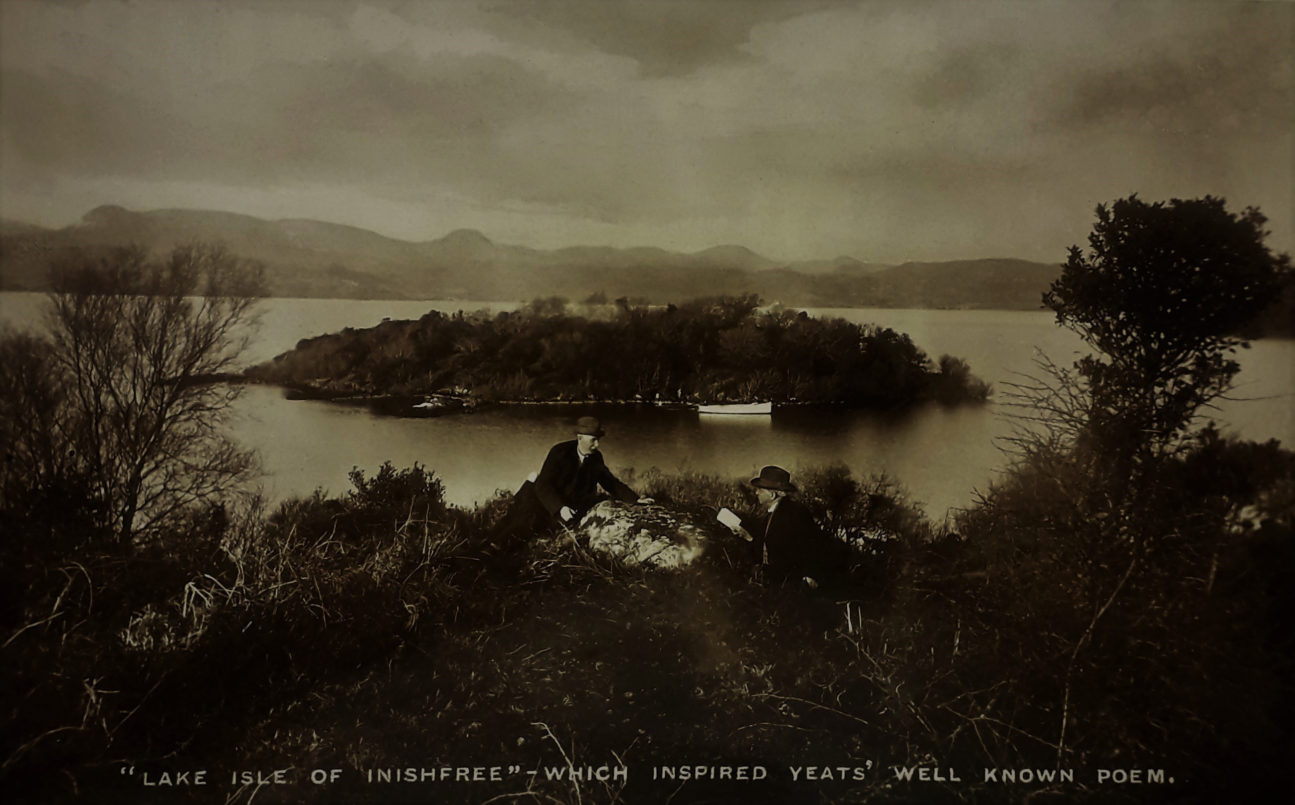 A postcard print of the Isle of Innisfree on Lough Gill in County Sligo. An annotation on the image side of the card reads '"Lake Isle of Innisfree" - which inspired Yeats' well known poem'.