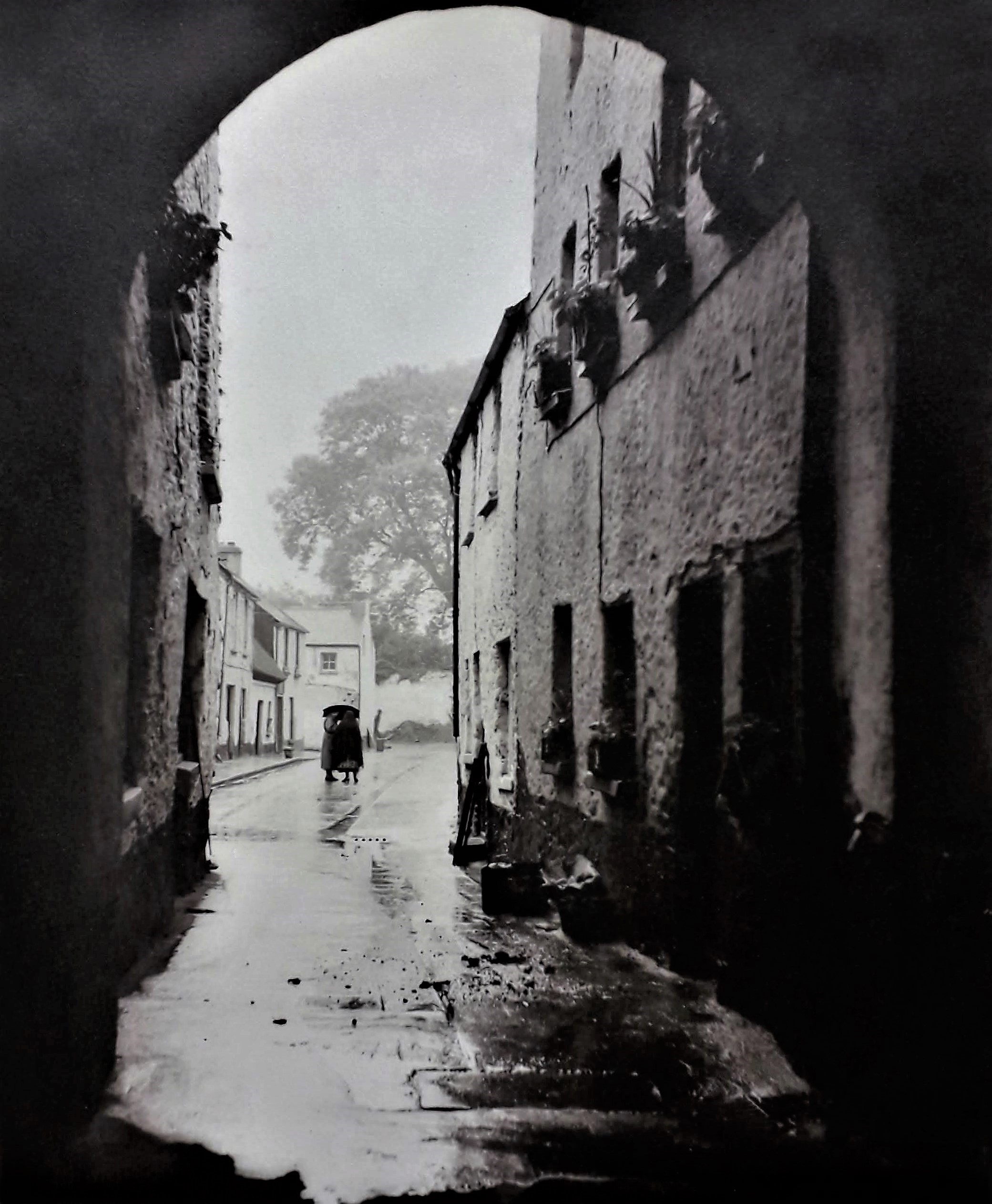 An image of archway and lane way in Killarney in County Kerry. A manuscript caption to the print reads 'Wet day, Killarney'.