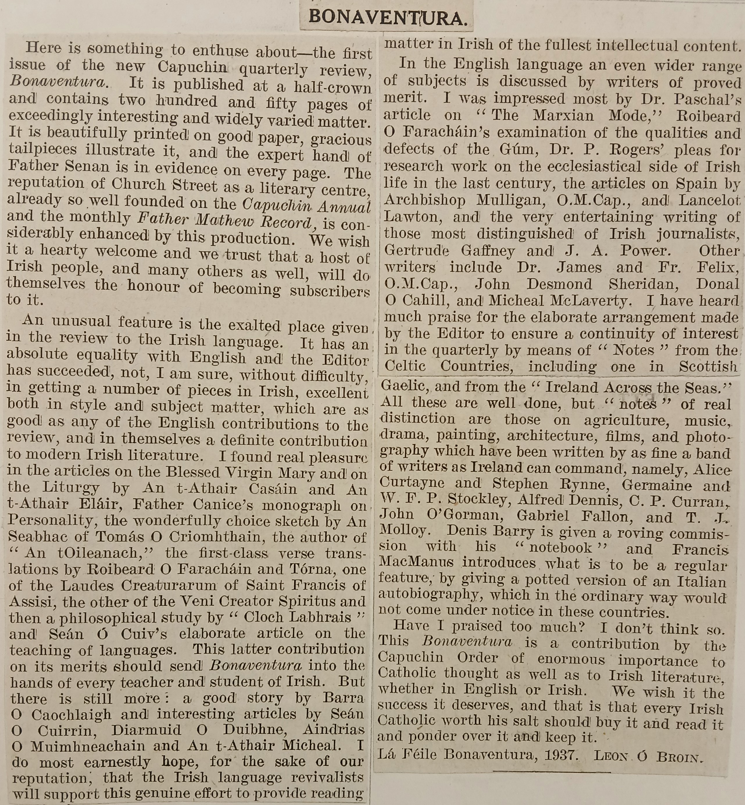 A clipping of a review by León Ó Broin of the first edition of ‘Bonaventura’. The review was published in ‘The Leader’ (17 July 1937).