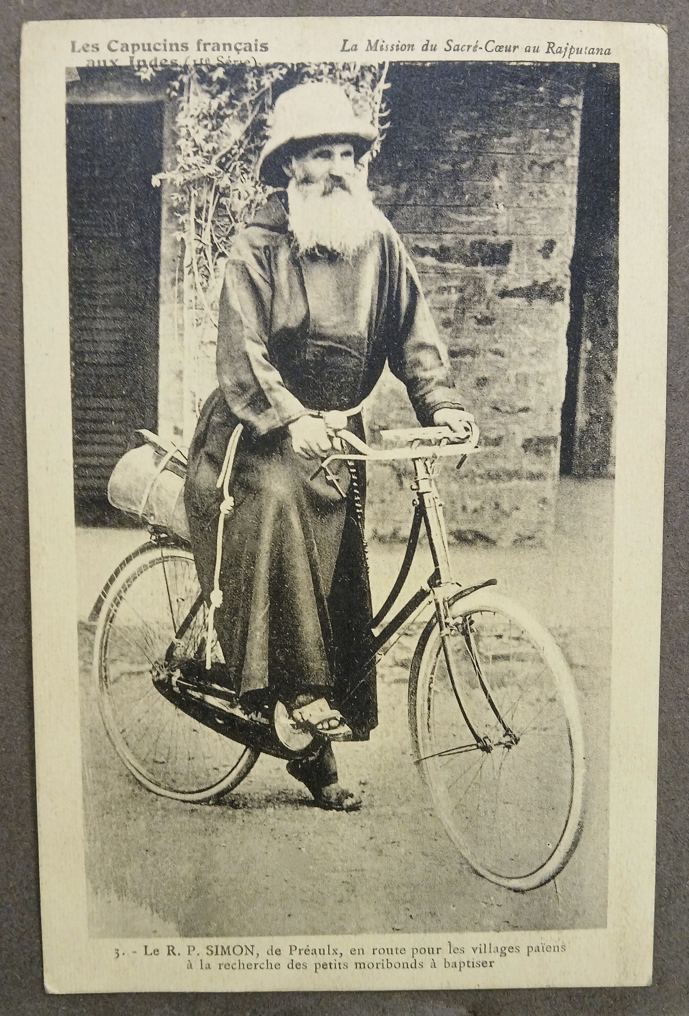 A postcard print showing Père Simon, a French Capuchin missionary, cycling to an India village. The card forms part of the ‘Les Capucins francais aux Indes’ series.