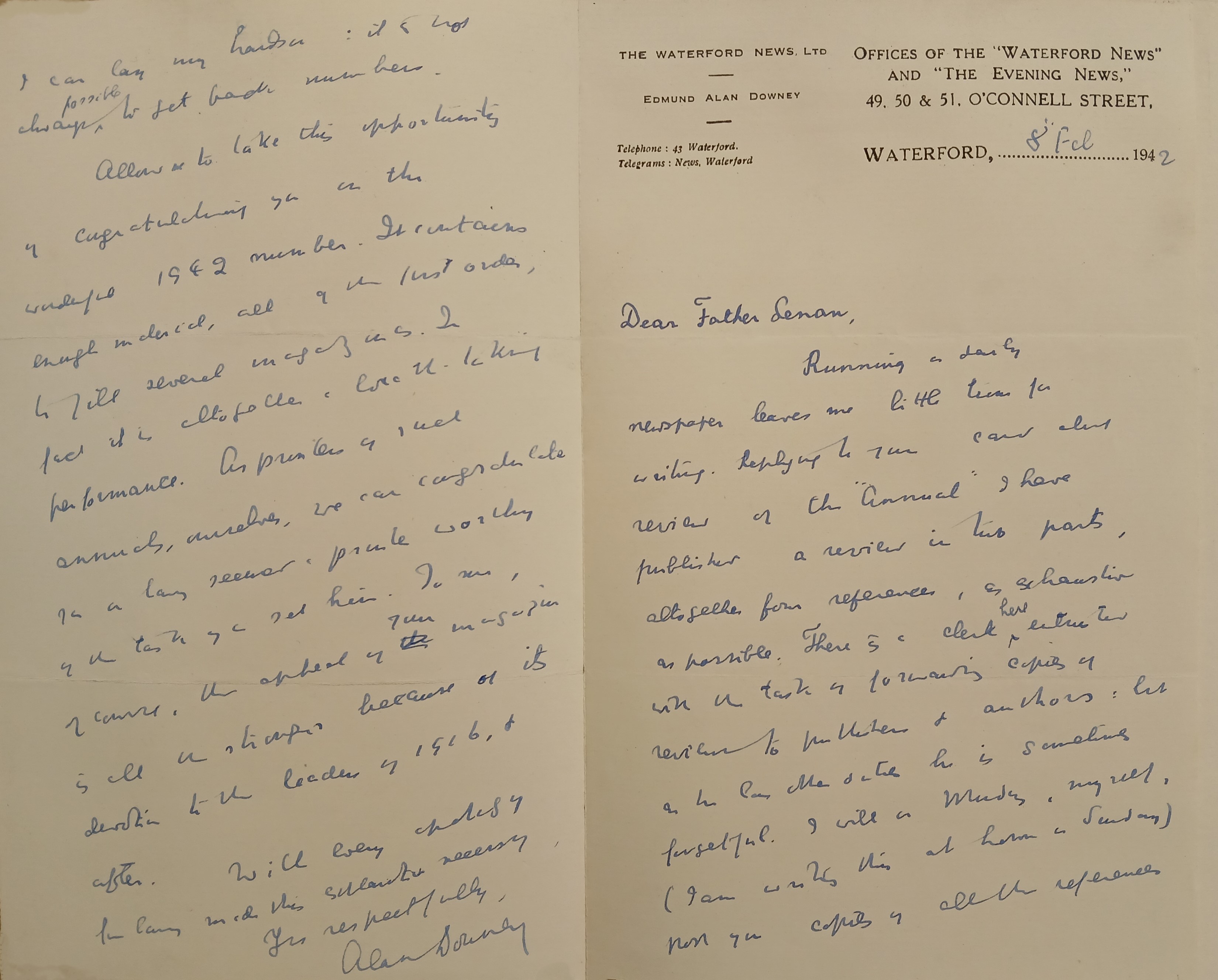 A letter from Alan Downey, ‘Waterford News’ Offices, 49-51 O’Connell Street, Waterford, to Fr. Senan Moynihan OFM Cap. conveying his impressions of the 1942 edition of ‘The Capuchin Annual’.