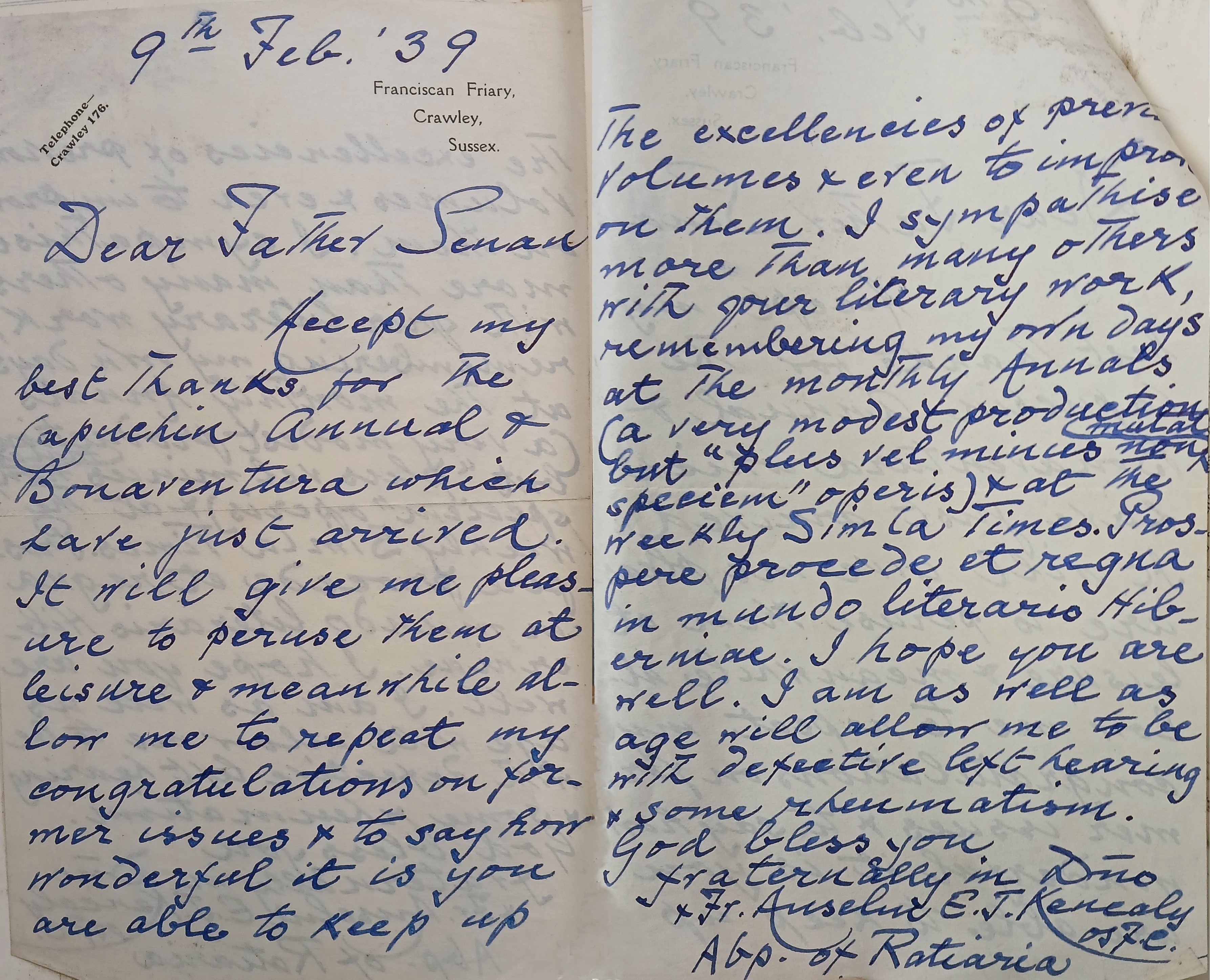 Letter from Archbishop Anselm Edward John Kenealy OFM Cap., Franciscan Friary, Crawley, Essex, to Fr. Senan Moynihan OFM Cap. thanking him for the copy of ‘The Capuchin Annual’ and recalling his own literary work while Archbishop of Simla in India.