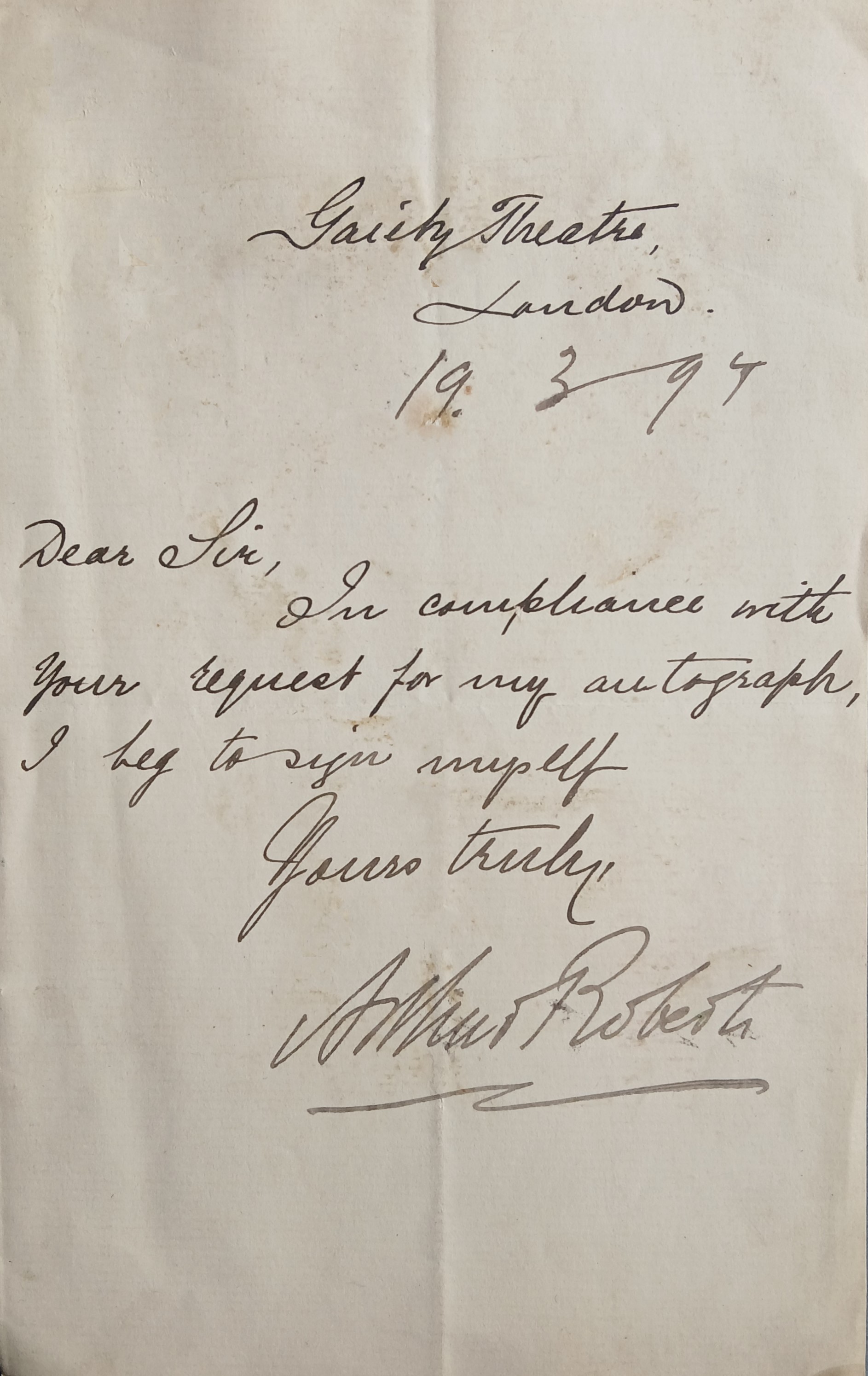 A letter from Arthur Roberts, Gaiety Theatre, London, to John MacKinlay forwarding his autograph.