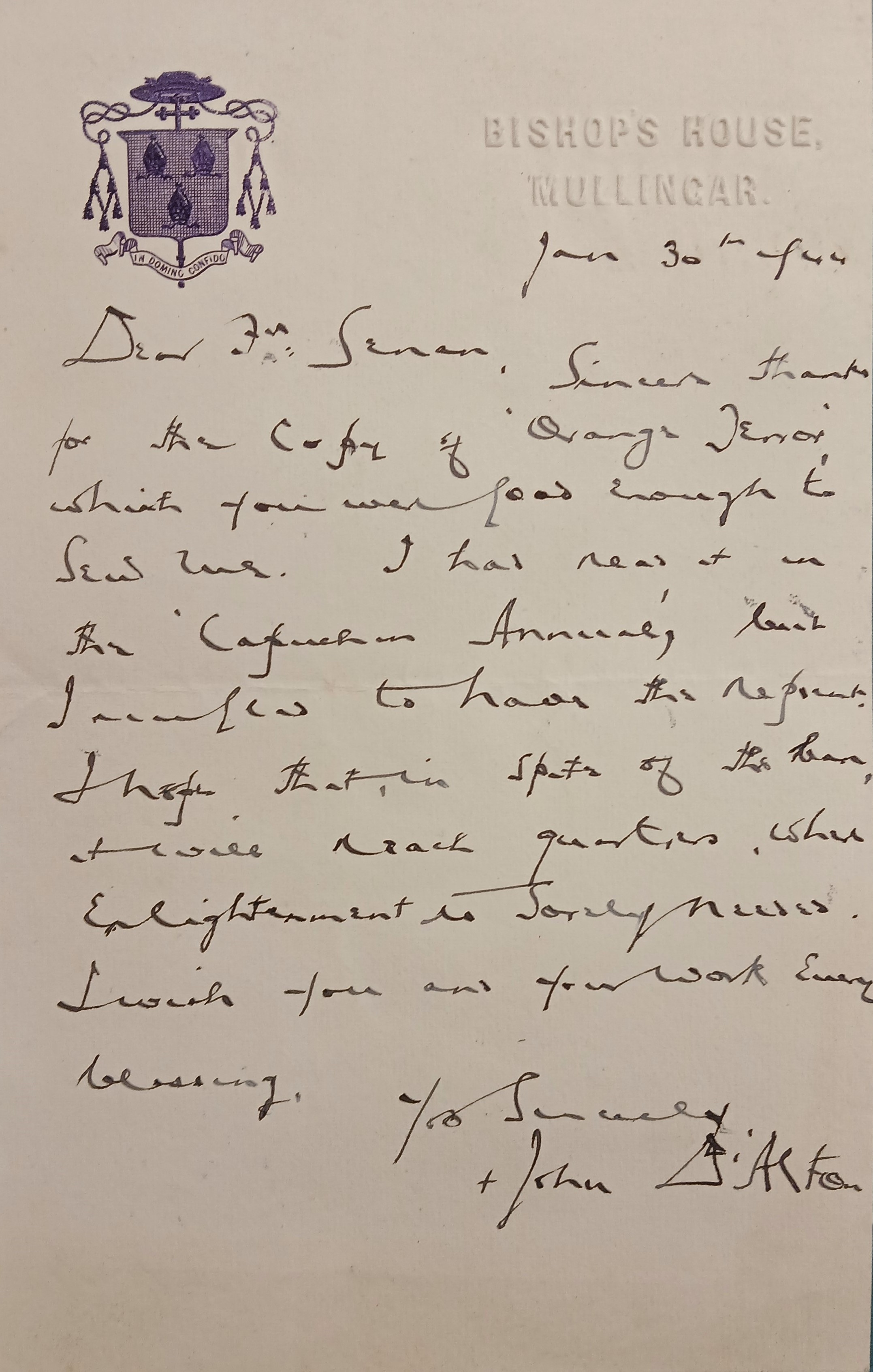 A letter from Bishop John D’Alton to Fr. Senan Moynihan OFM Cap. thanking him for the copy of the ‘Orange Terror’ offprint. D’Alton adds ‘I hope that in spite of the ban [in Northern Ireland] it will reach quarters where enlightenment is sorely needed’.