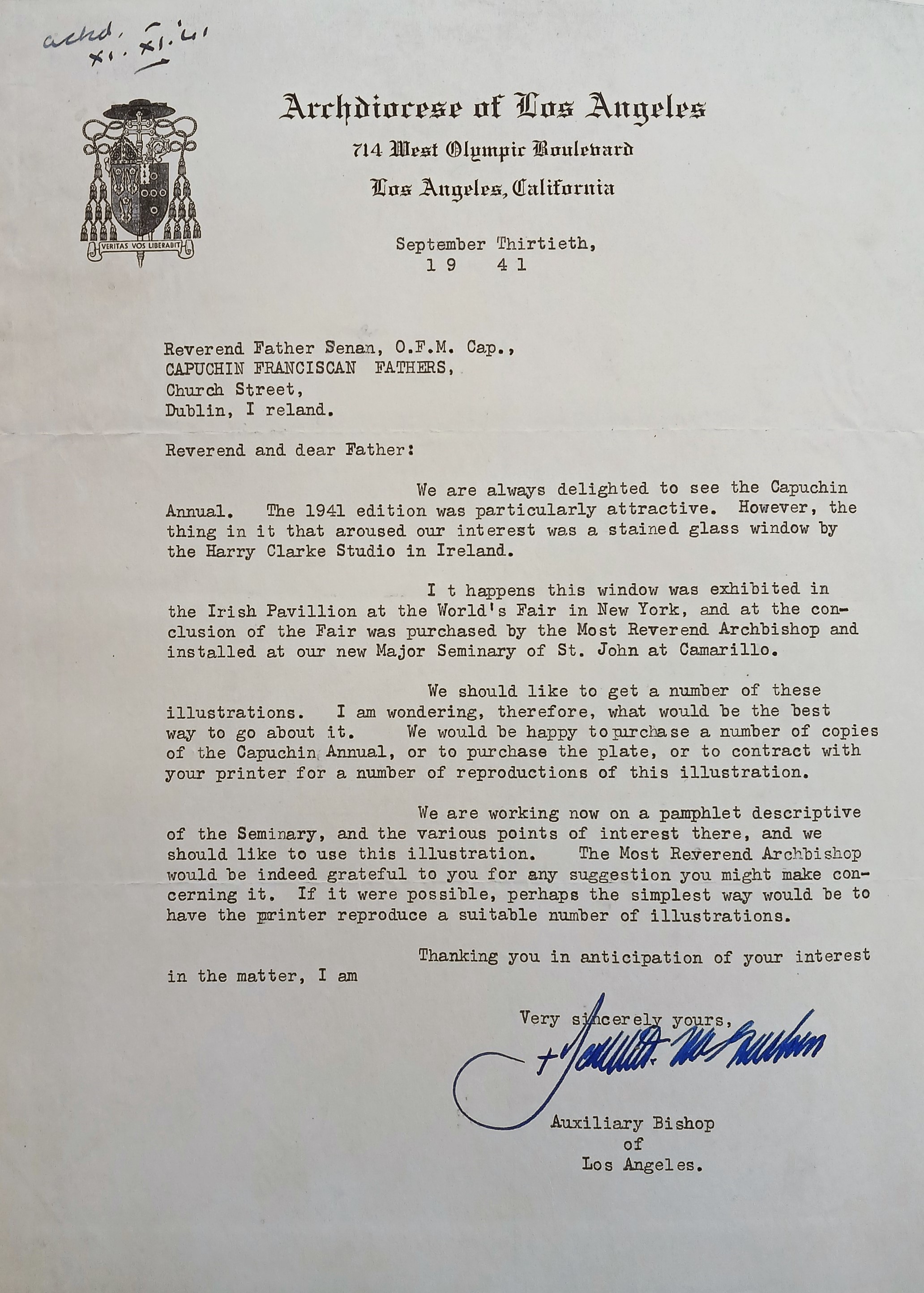 Letter from Bishop Joseph Thomas McGucken, Auxiliary Bishop of Los Angeles, to Fr. Senan Moynihan OFM Cap. seeking copies of an illustration of a stained-glass window designed by Harry Clarke Studios which was recently installed in St. John’s Seminary in Camarillo, California. The window was originally displayed at the Irish Pavilion at the New York World Fair. The illustration appeared in ‘The Capuchin Annual’ (1941) which McGucken praises.