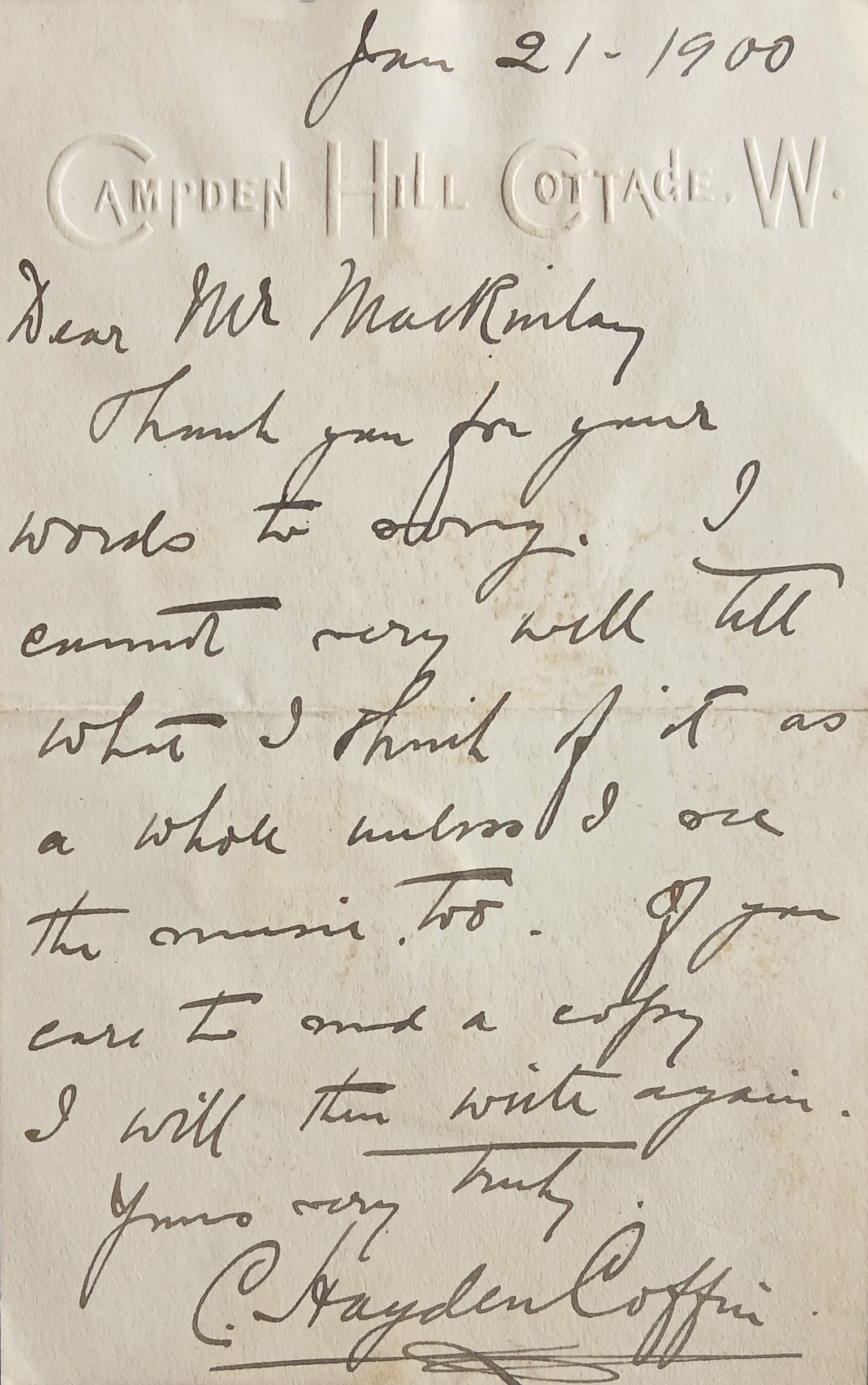 A letter from Charles Hayden Coffin, Camden Hill Cottage, London, to John MacKinlay asking him to send the musical accompaniment to the song lyrics he has already sent.