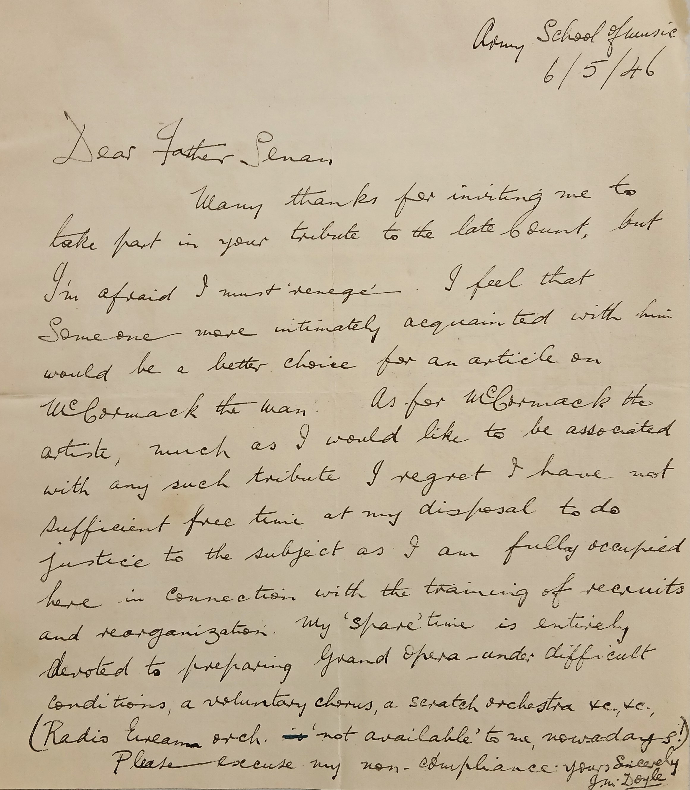 A letter from Commandant James Michael Doyle, Army School of Music, to Fr. Senan Moynihan OFM Cap. expressing his regret for being unable to contribute an article for a feature on John McCormack to be published in ‘The Capuchin Annual’.