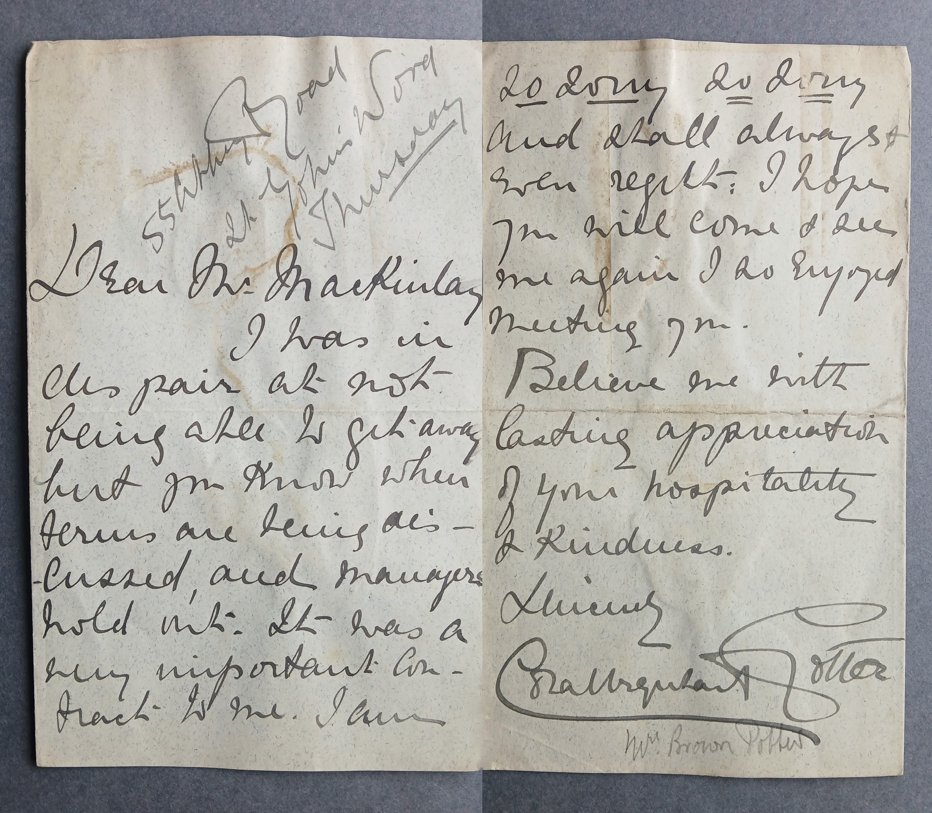 A letter from Cora Urquhart Brown-Potter to Antionette MacKinlay (née Sterling) apologising for not meeting her as she was having important discussions with managers.
