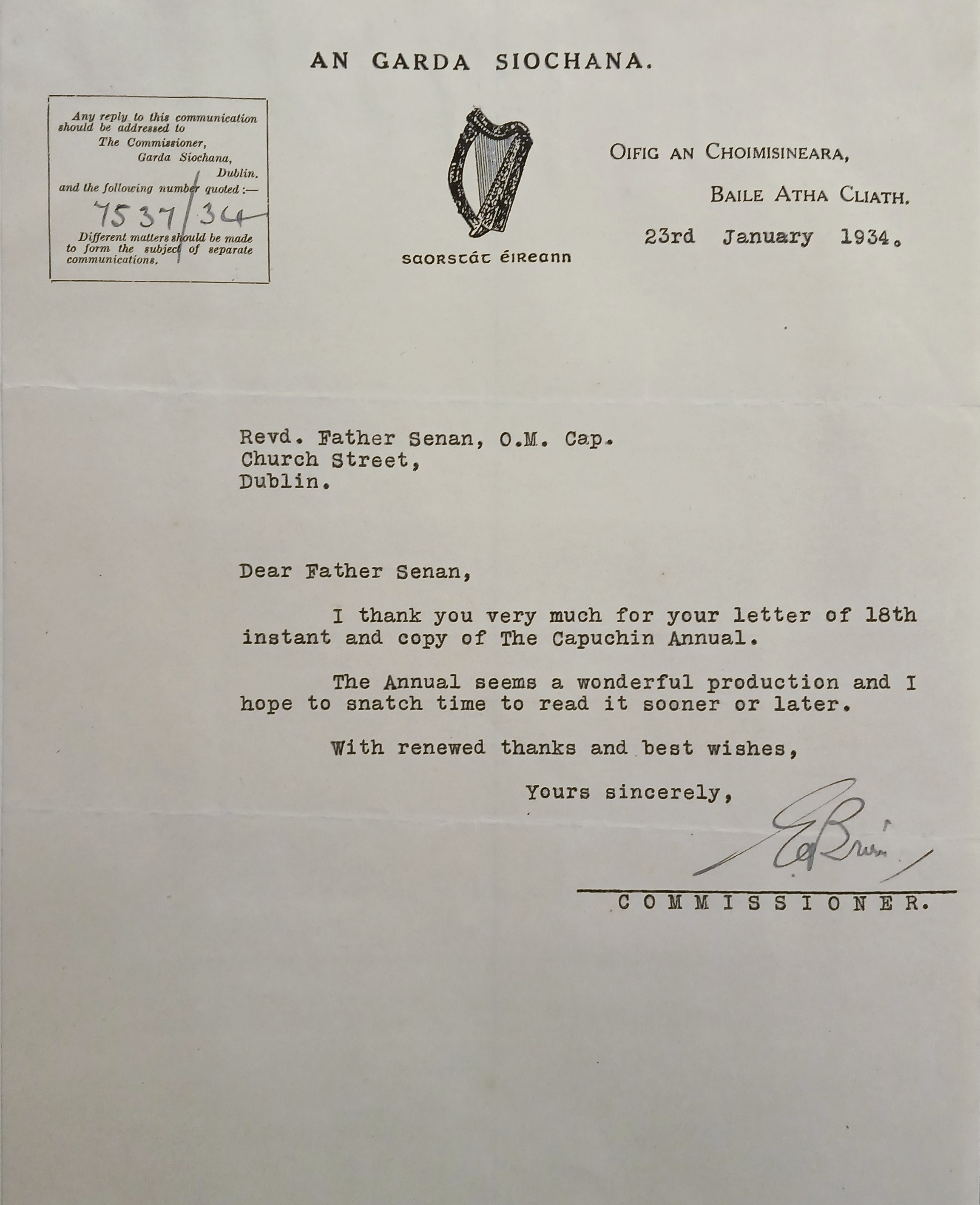 A letter from Eamon (‘Ned’) Broy, Garda Commissioner, to Fr. Senan Moynihan OFM Cap., thanking him for a copy of ‘The Capuchin Annual’.