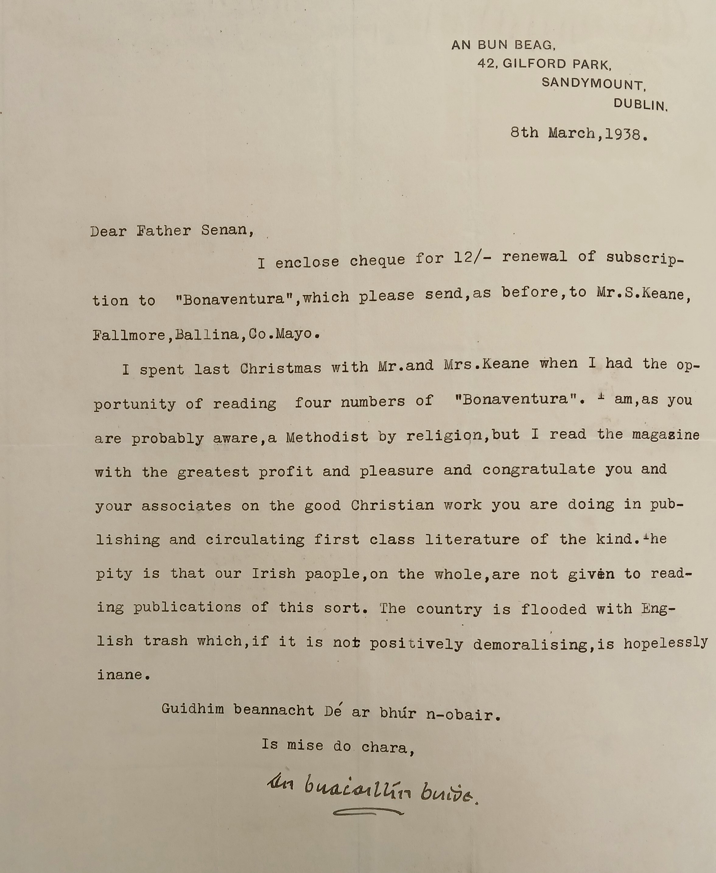 A letter from Earnán De Siúnta (‘An Buachaillín Buidhe’) to Fr. Senan Moynihan OFM Cap. congratulating him on the ‘good Christian work’ in publishing the ‘Bonaventura’ quarterly. He adds ‘The pity is that our Irish people, on the whole, are not given to reading publications of this sort. The country is flooded with English trash, which if not positively demoralising, is hopelessly inane’.