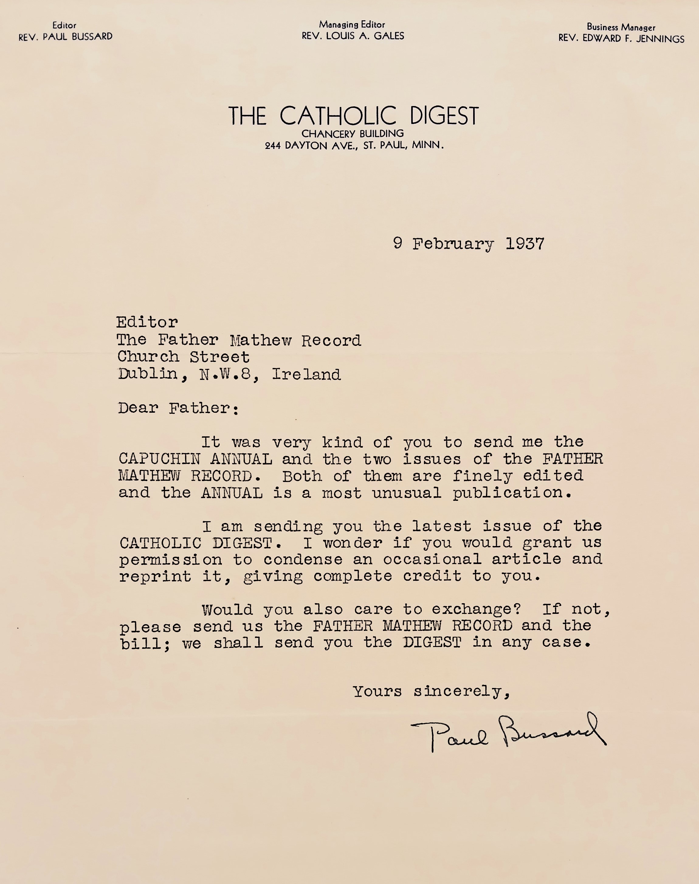 Letter from Fr. Paul Bussard, editor of the ‘Catholic Digest’, to Fr. Senan Moynihan OFM Cap. seeking permission to reprint condensed articles and content from ‘The Capuchin Annual’.