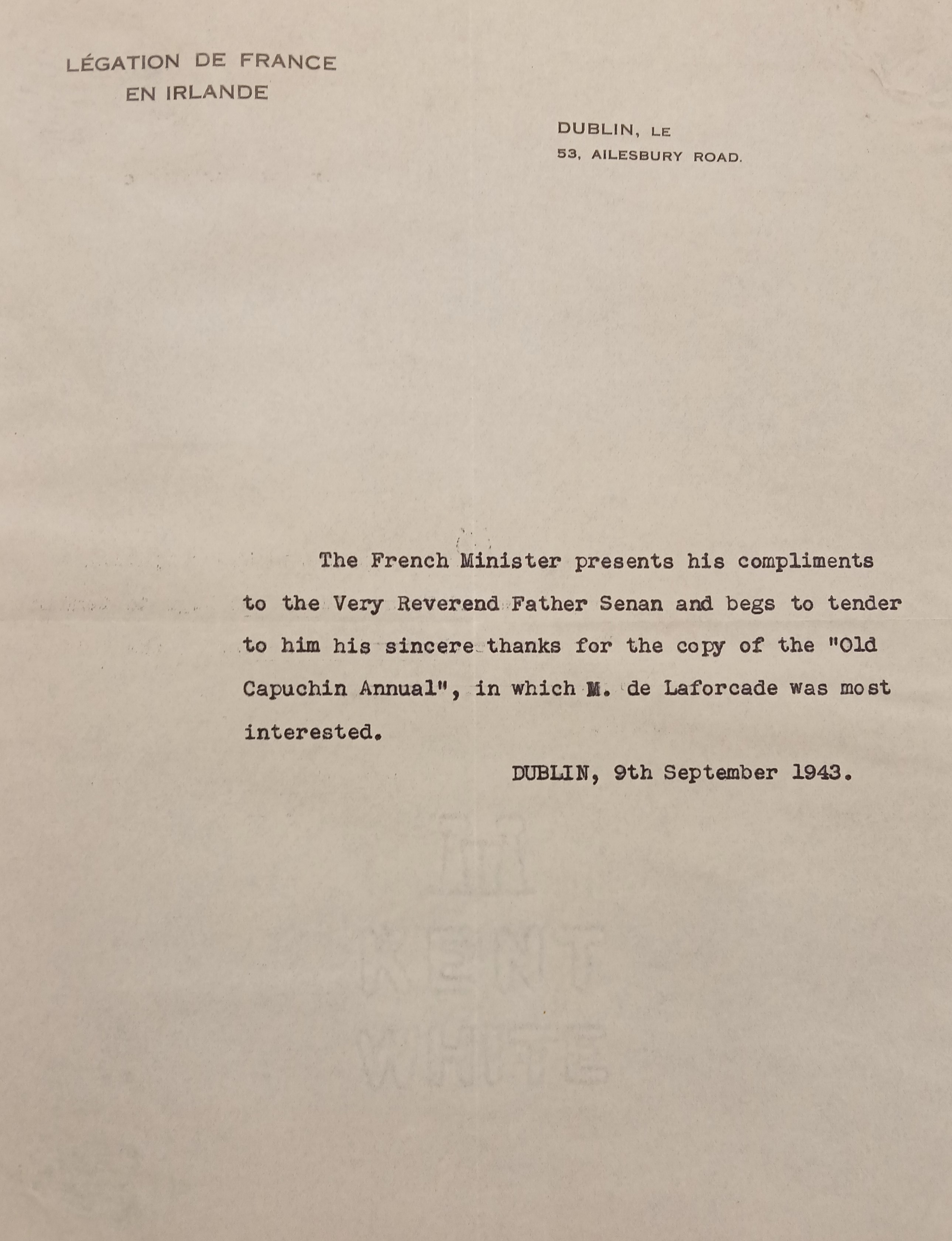 A letter from François-Xavier de Laforcade, French Minister to Ireland, to Fr. Senan Moynihan OFM Cap. thanking him for a copy of ‘The Capuchin Annual’ (1943).