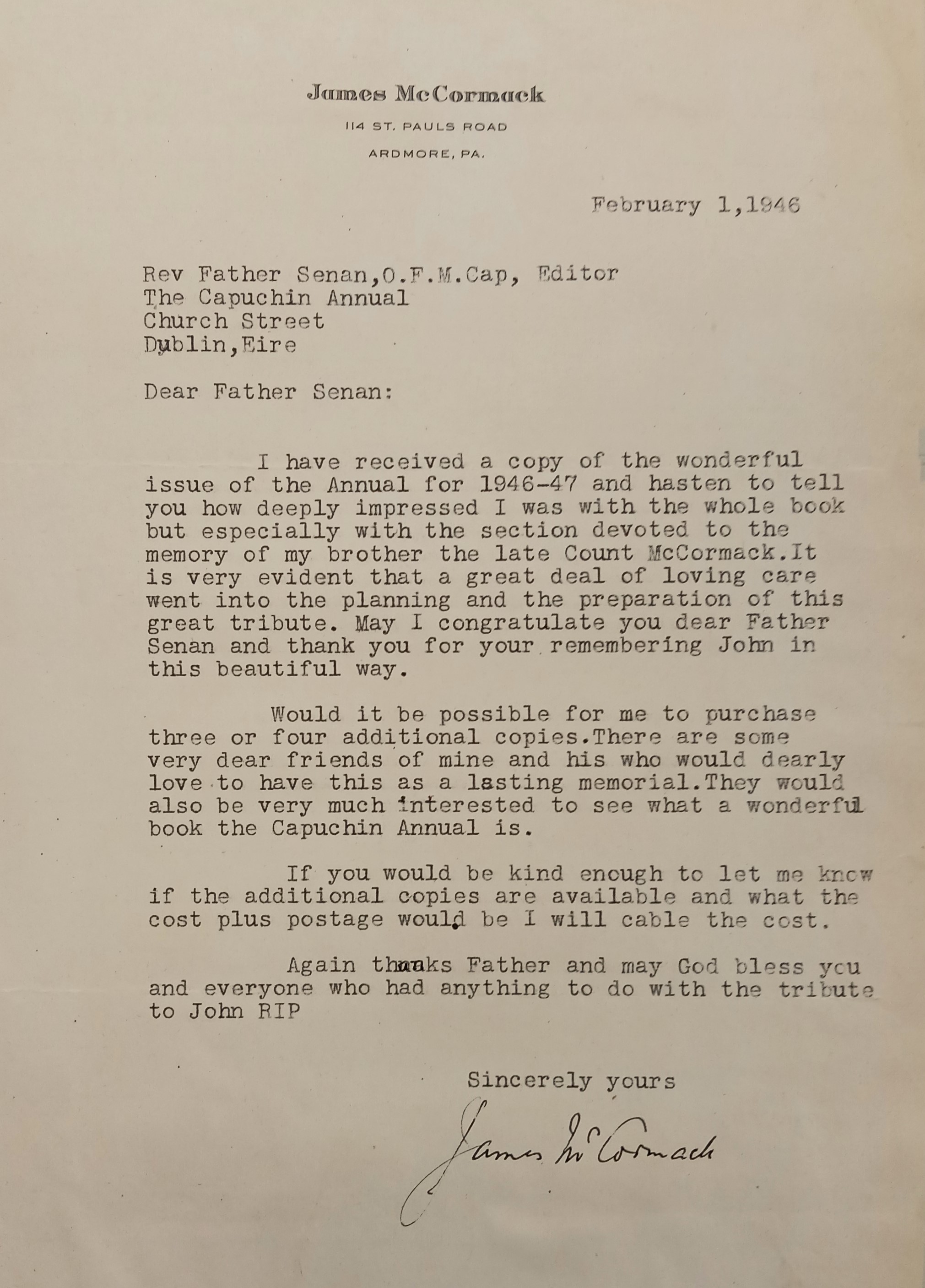 A letter from James McCormack to Fr. Senan Moynihan OFM Cap. thanking him for the copy of ‘The Capuchin Annual’ and for the ‘great tribute’ to his late brother.