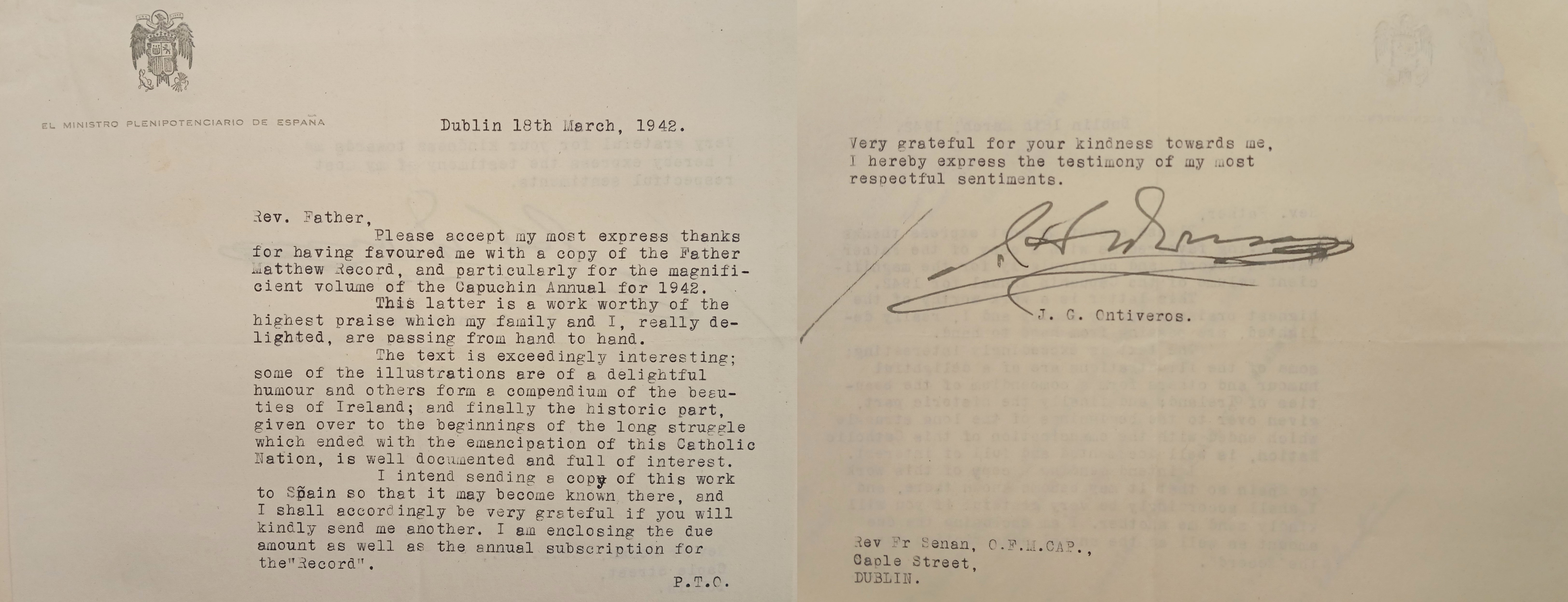 A letter from Don Juan Garcia-Ontiveros y Laplana, Spanish Minister to Ireland, to Fr. Senan Moynihan OFM Cap. thanking him for sending a copy of ‘The Capuchin Annual’ and expressing his admiration for the publication.