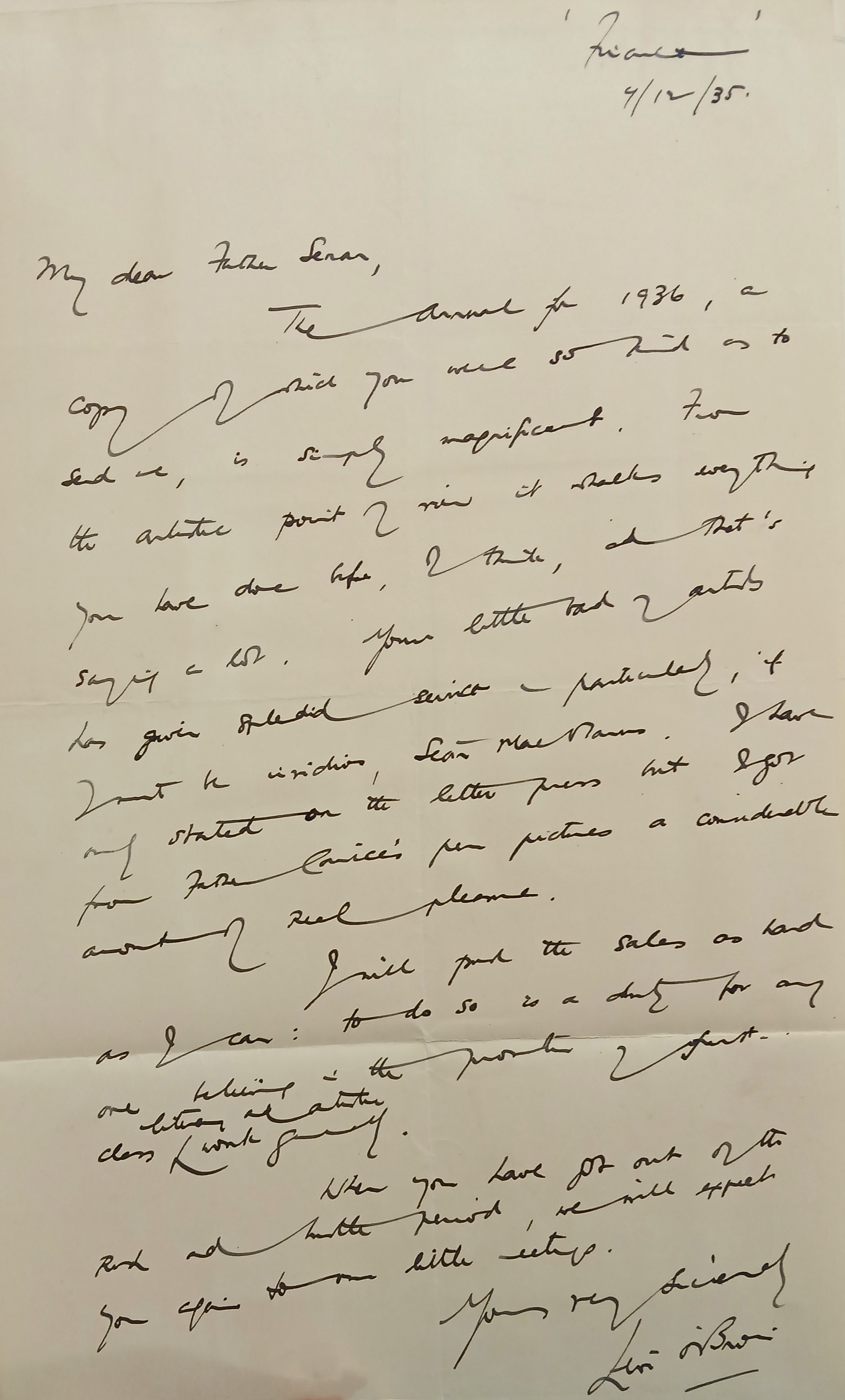 Letter from León Ó Broin to Fr. Senan Moynihan OFM Cap. congratulating the friar on the latest edition of ‘The Capuchin Annual’ which he describes as ‘simply magnificent’.