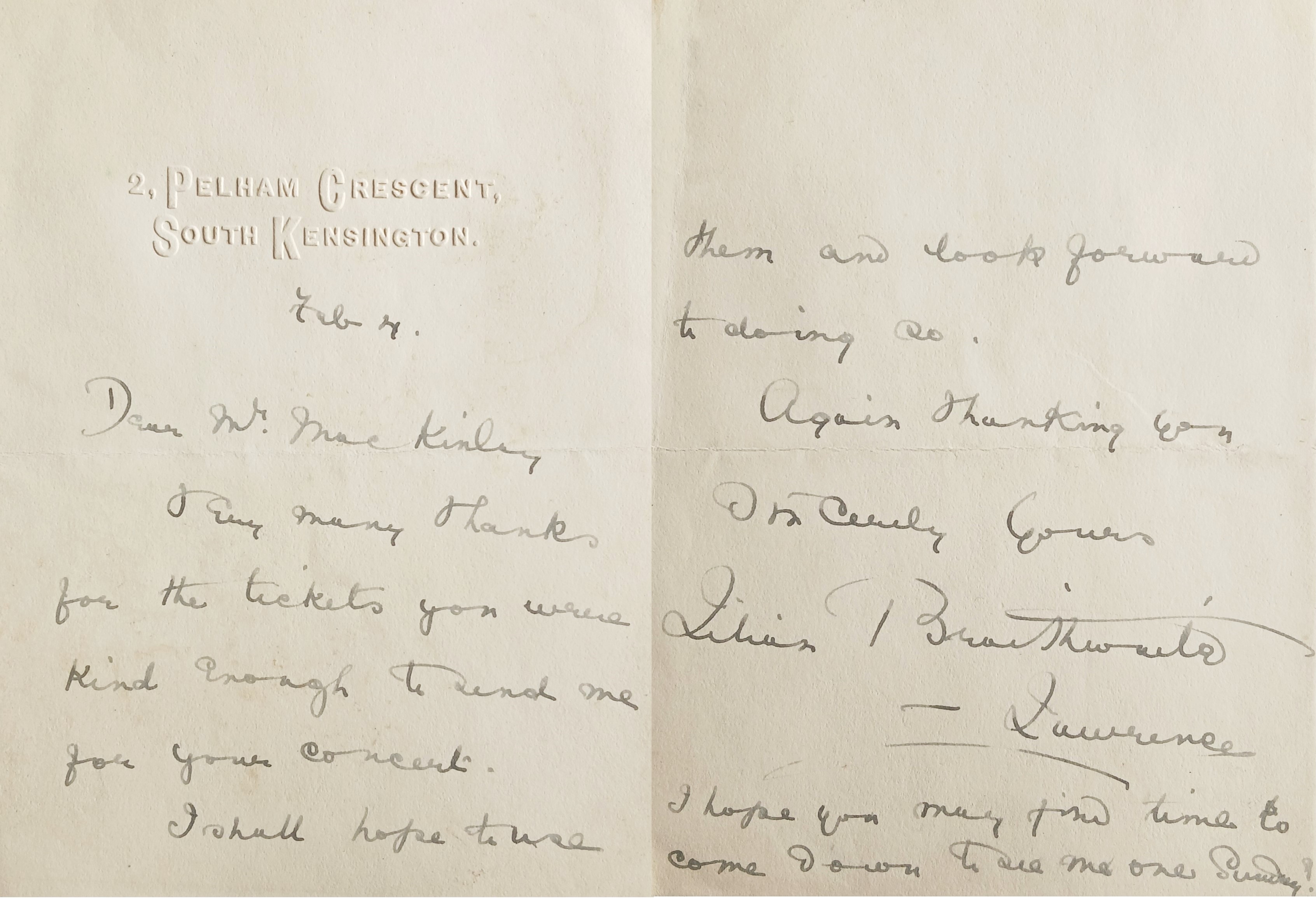 A letter from Lilian Braithwaite to Antionette MacKinlay (née Sterling) thanking her for the gift of two tickets for her concert.