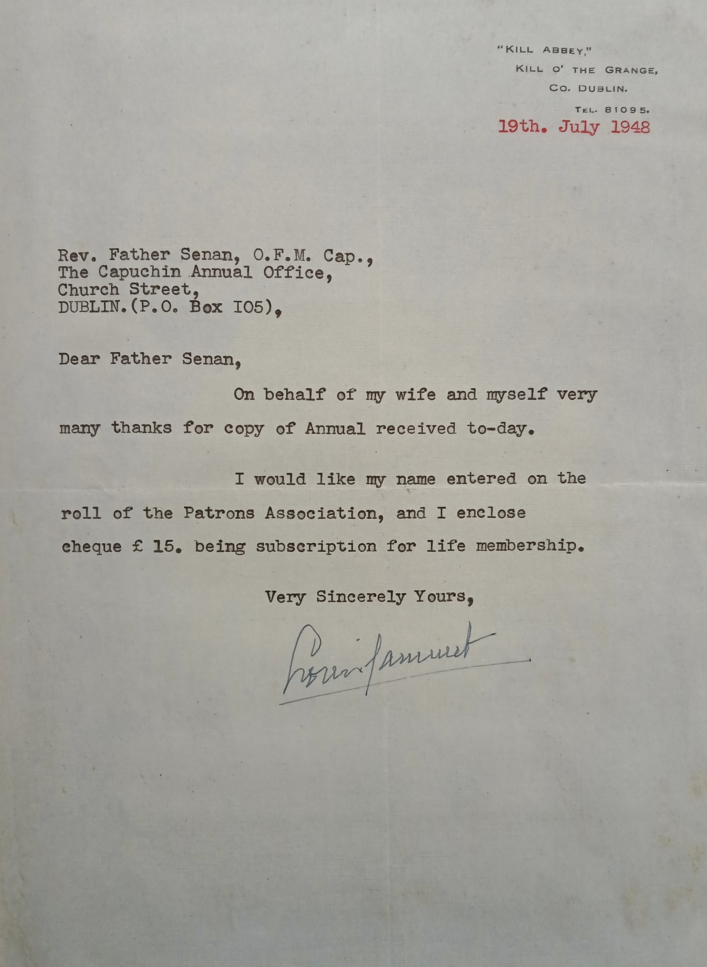 A letter from Louis Jammet, Kill Abbey, Kill O’ the Grange, Dublin, to Fr. Senan Moynihan OFM Cap. asking that he and his wife (Yvonne Jammet) be entered into the roll of the Patrons of ‘The Capuchin Annual’.