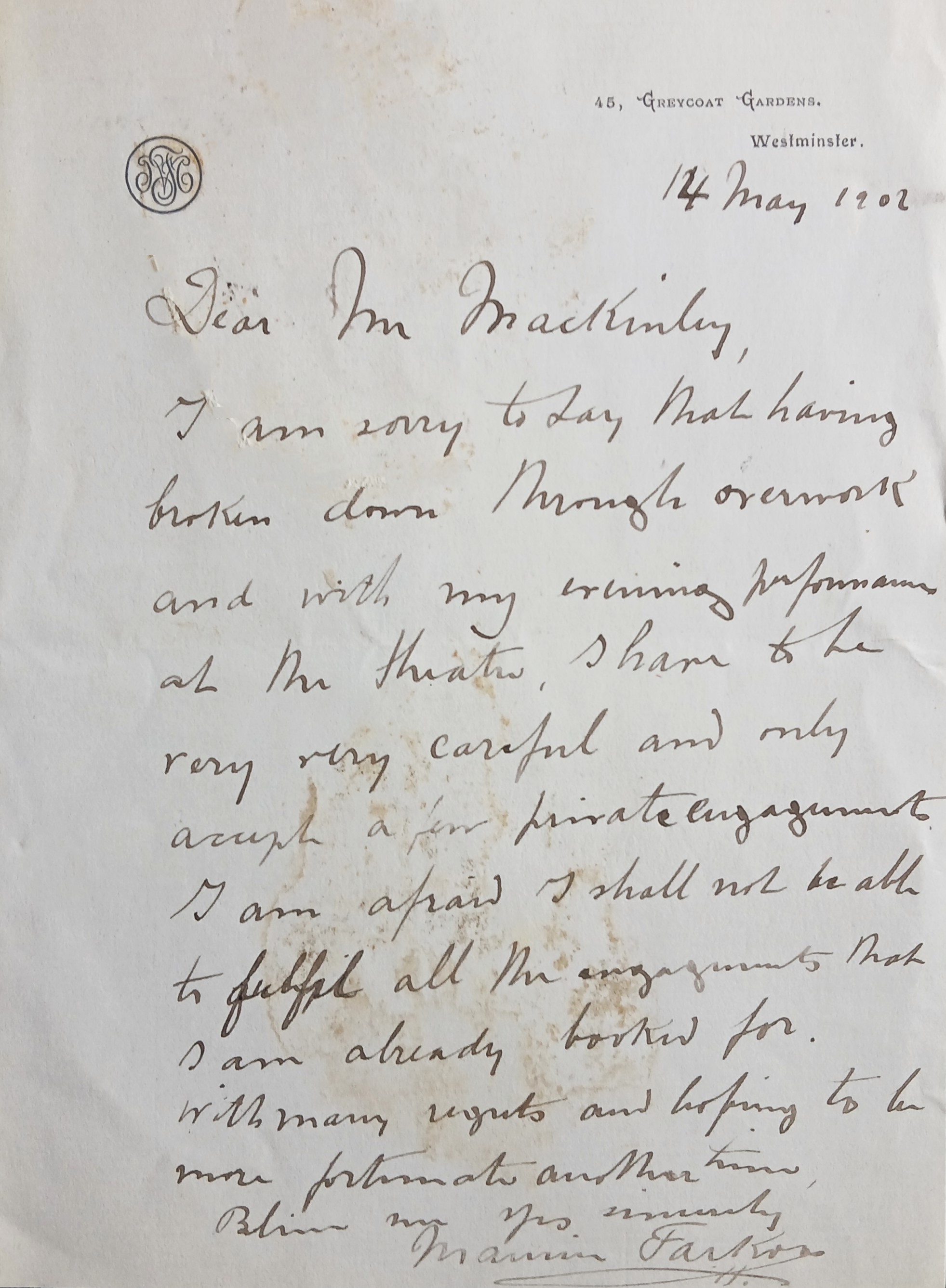 A letter from Maurice Farkoa to Antionette MacKinlay (née Sterling) stating that he has ‘broken down’ due to overwork and can only ‘accept a few private engagements’