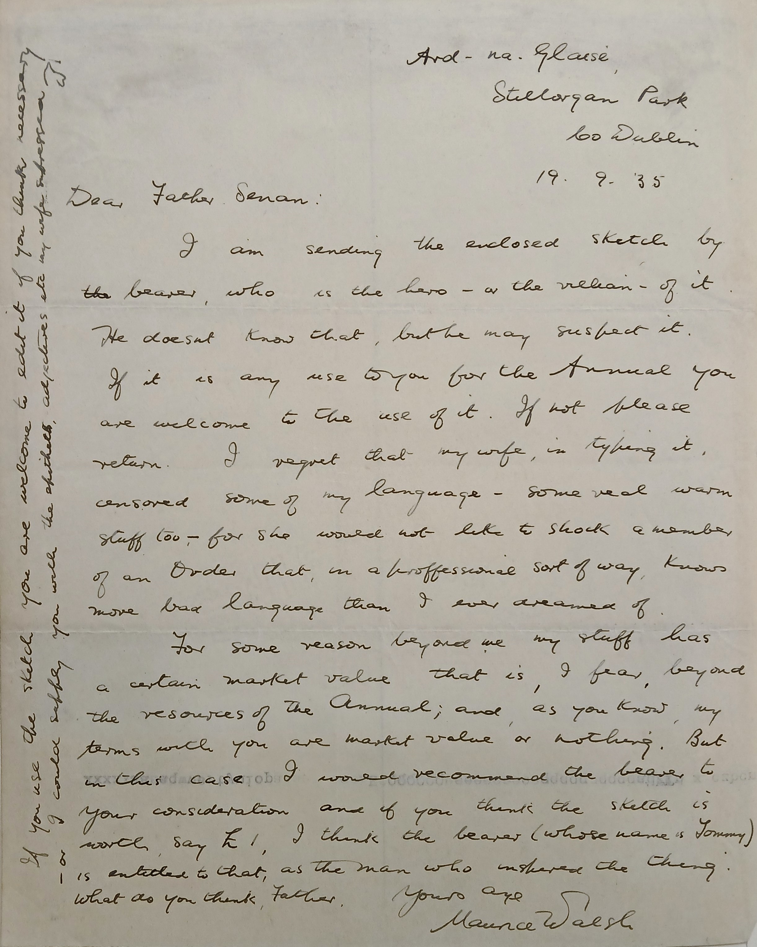 Letter from Maurice Walsh, Ard na Glaise, Stillorgan Park, County Dublin, to Fr. Senan Moynihan OFM Cap. recommending the ‘enclosed sketch by the bearer’ which may be worthy of publication in ‘The Capuchin Annual’. Walsh added ‘For some reason beyond me, my stuff has a certain market value that is, I fear, beyond the resources of the Annual; and, as you know, my terms with you are market value or nothing’.