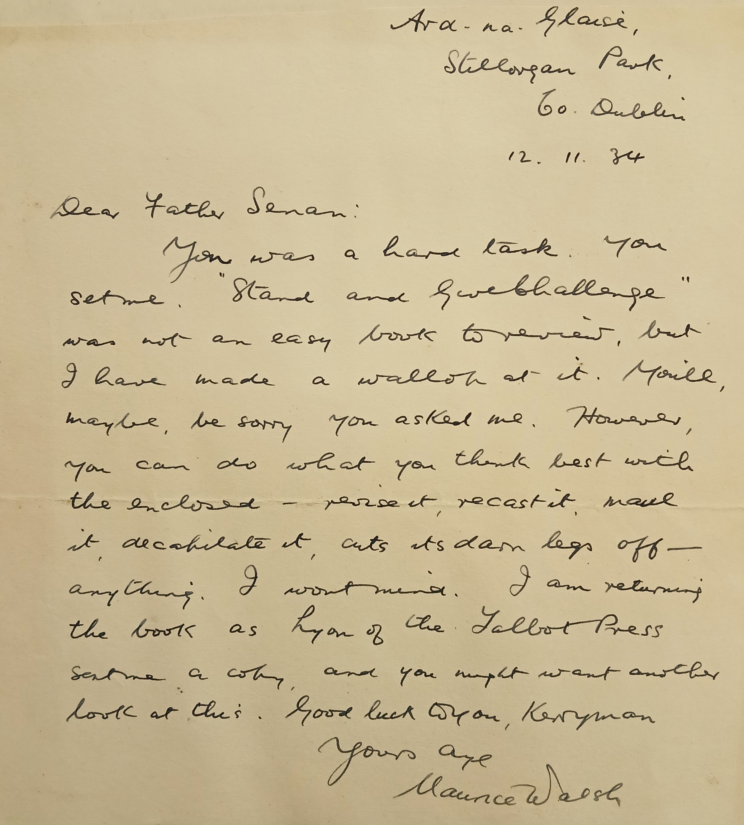 A letter from Maurice Walsh, Ard na Glaise, Stillorgan Park, County Dublin, to Fr. Senan Moynihan OFM Cap. regarding a review of ‘Stand and give challenge’ by Francis MacManus.