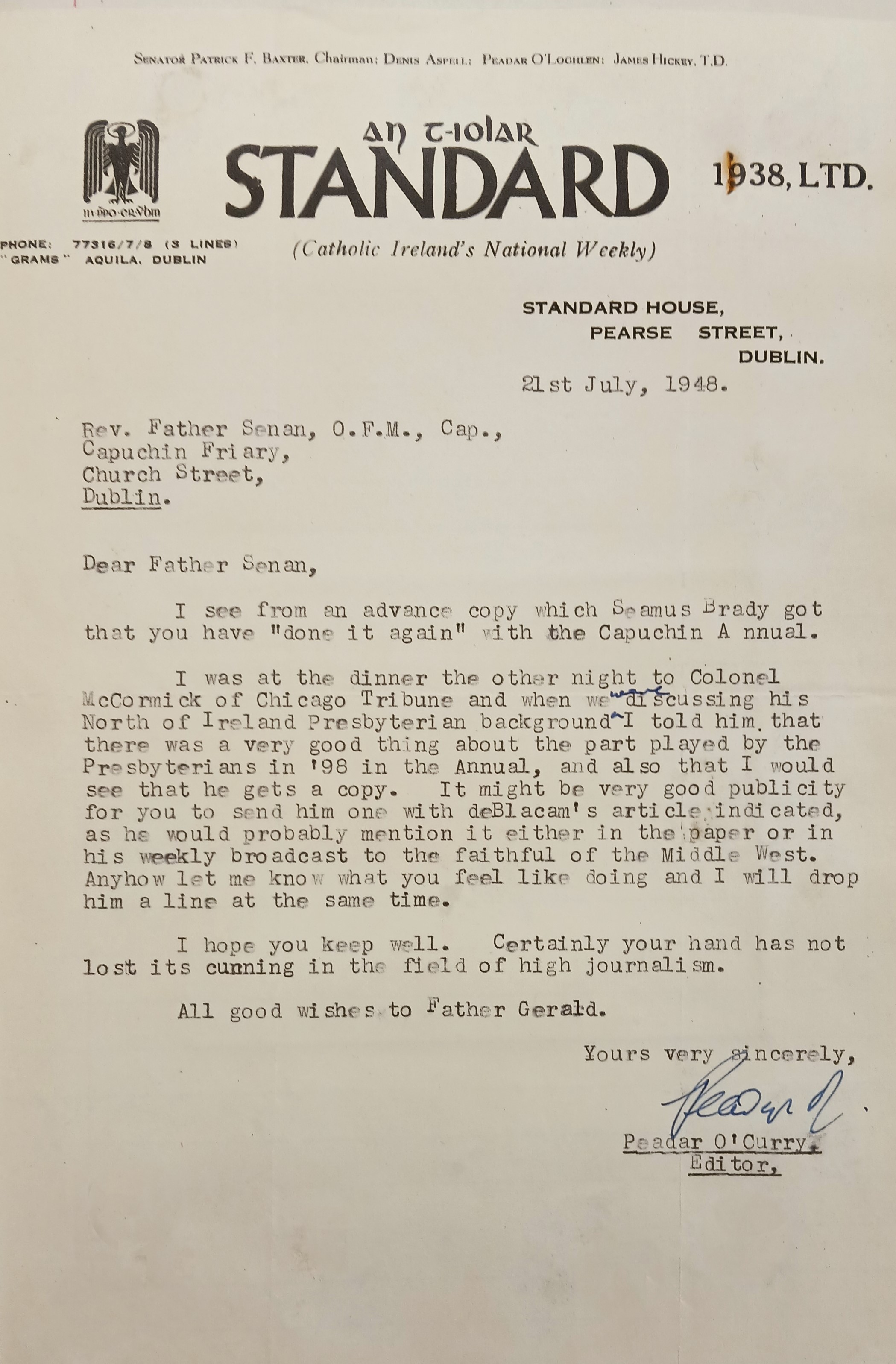 A letter from Peadar O’Curry, editor of ‘The Standard’, to Fr. Senan Moynihan OFM Cap. asking that a copy of the ‘Annual’ containing an article about the role of Presbyterians in the 1798 rebellion be sent to Colonel McCormick of the ‘Chicago Tribune’.