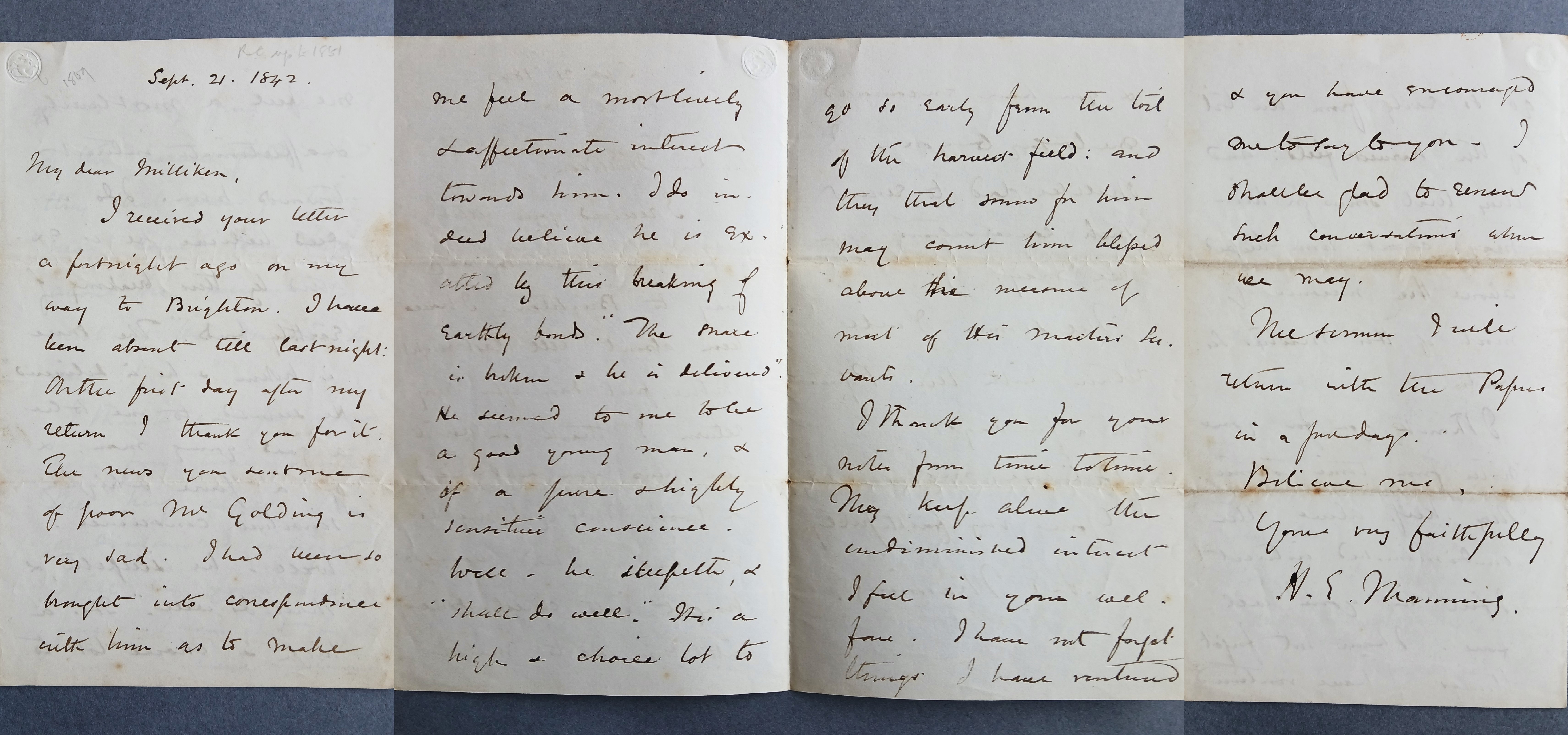 A letter from Rev. Henry Edward Manning to [Rev.] Milliken.