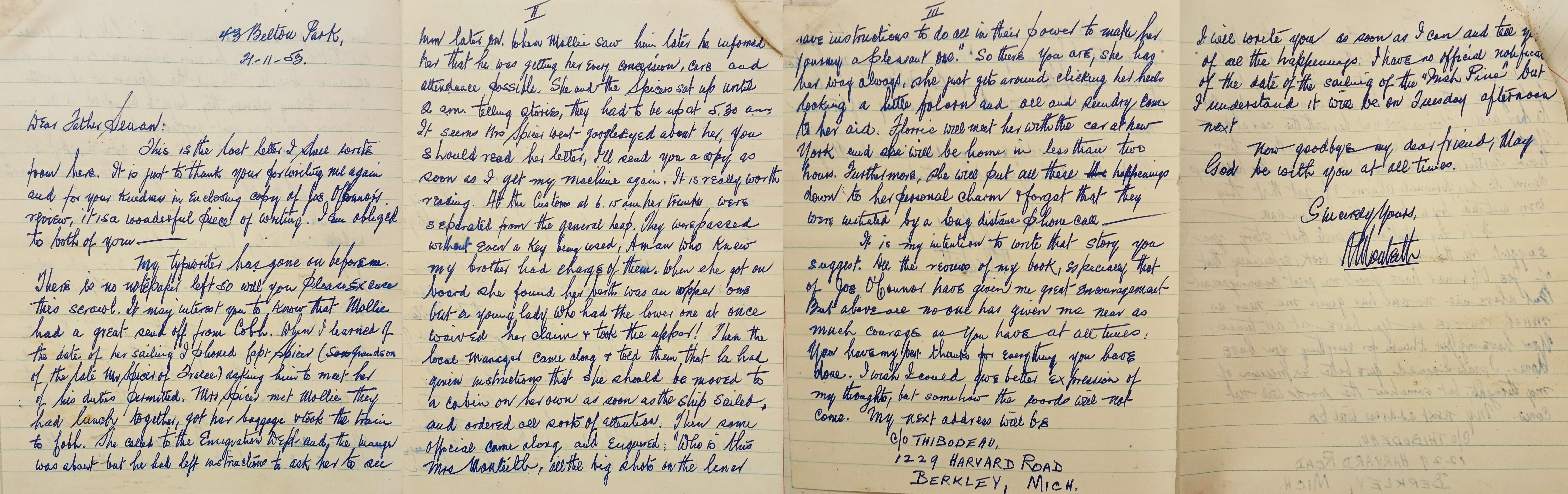 A letter from Robert Monteith to Fr. Senan Moynihan OFM Cap. regarding his arrangements for his imminent departure for the United States. Monteith affirms that this is the last letter he will write from Dublin and mentions his wife’s travel plans. He thanks Fr. Senan for all that he done for him and refers to his future writing plans.