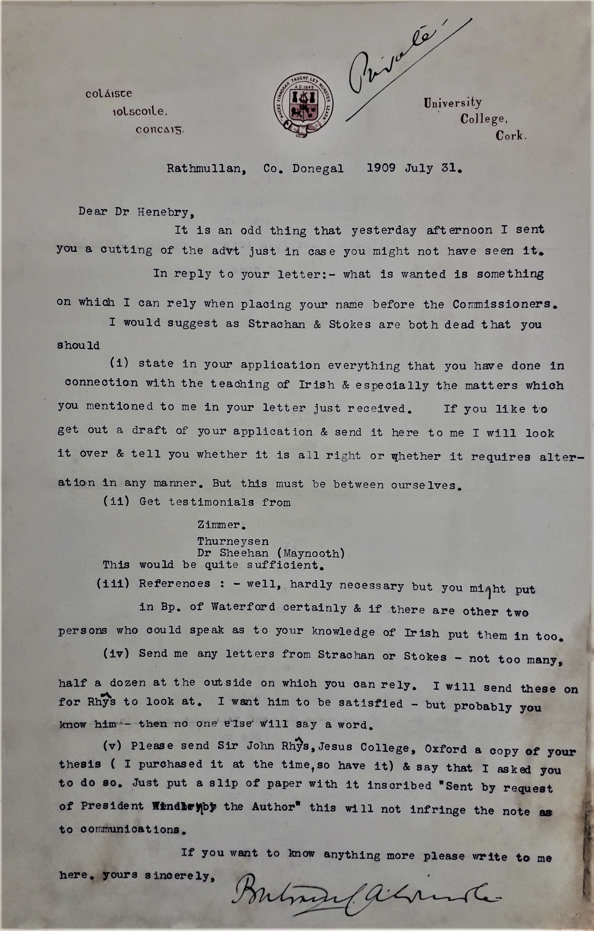 Letter from Sir Bertram Windle to Fr. Richard Henebry referring to the latter's application for the Chair of Irish language and literature in University College Cork.