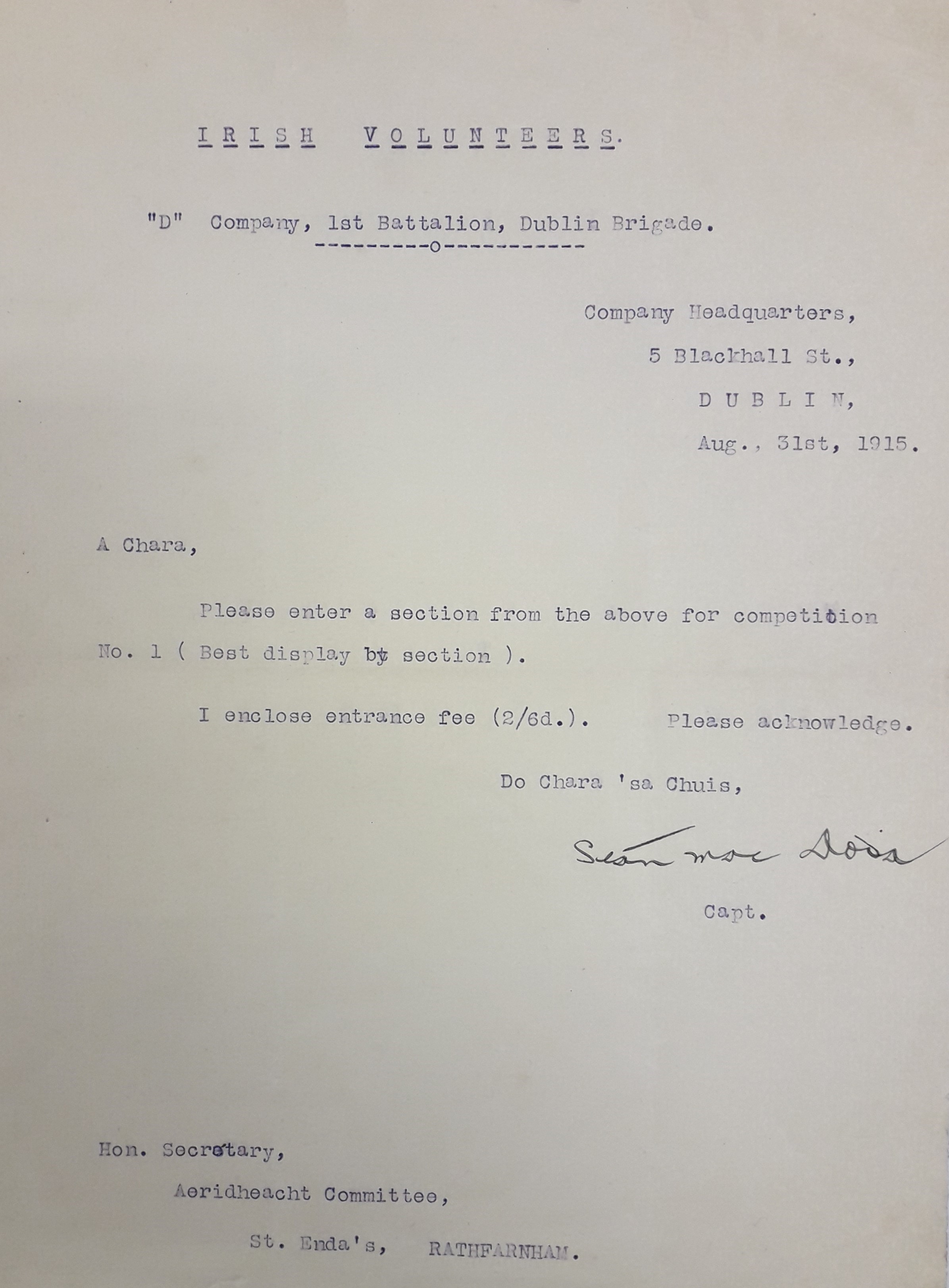 Letter to Patrick Pearse, Hon. Secretary, Aeridheacht Committee, St. Enda’s School, Rathfarnham, Dublin, from Seán Mac Aodha (Seán Heuston), Irish Volunteers “D” Company, 1st Battalion, Dublin Brigade, 5 Blackhall Street, Dublin, re a drill competition.