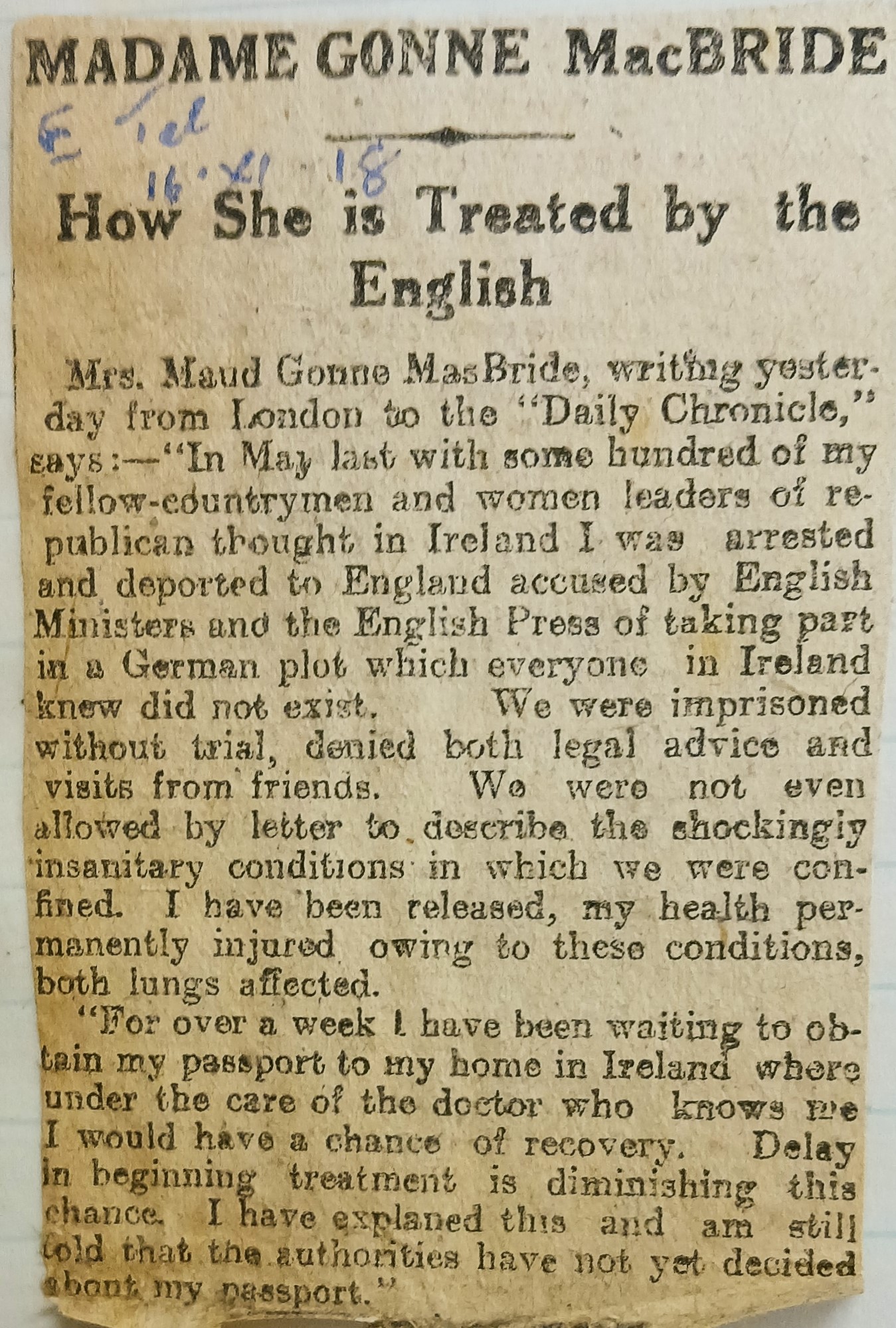 A clipping of article describing Maud Gonne MacBride’s arrest and imprisonment on account of her supposed involvement in the German Plot in May 1918. The clipping is taken from the ‘Evening Telegraph’ (16 November 1918).
