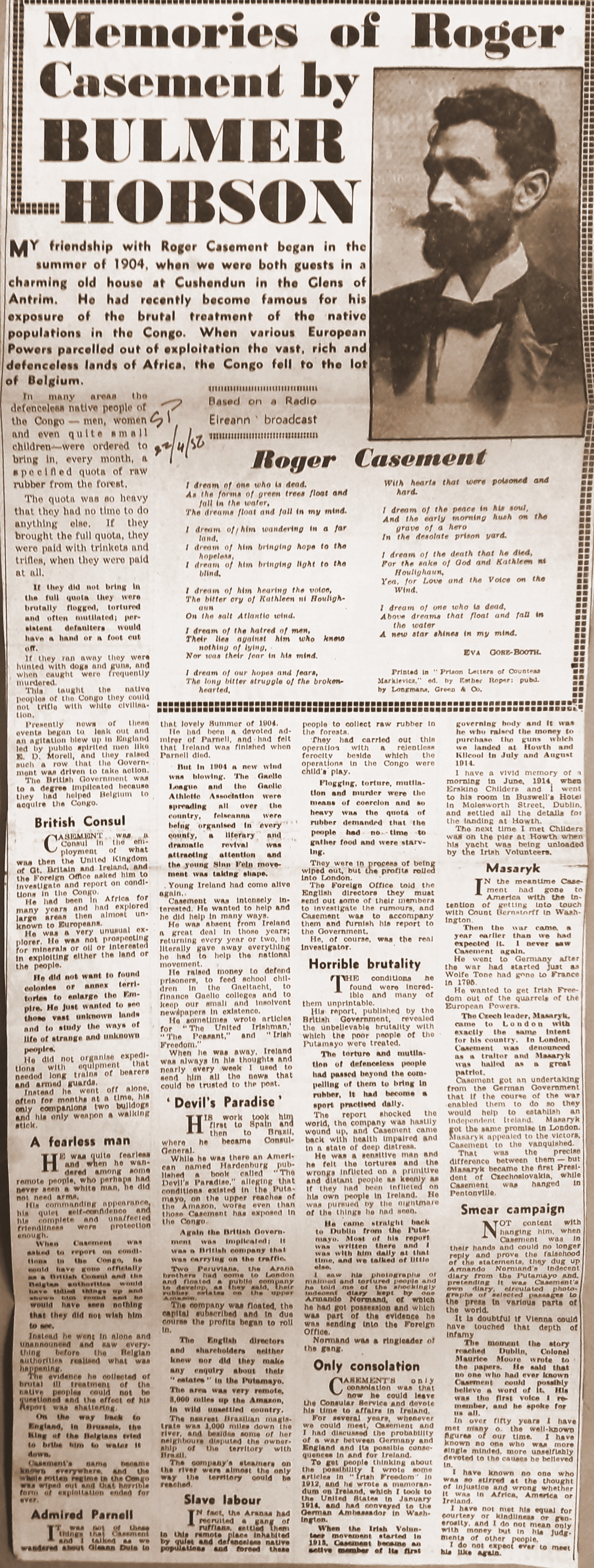 A clipping of an article titled ‘Memories of Roger Casement’ by Bulmer Hobson (‘Sunday Press’, 22 Apr. 1956).