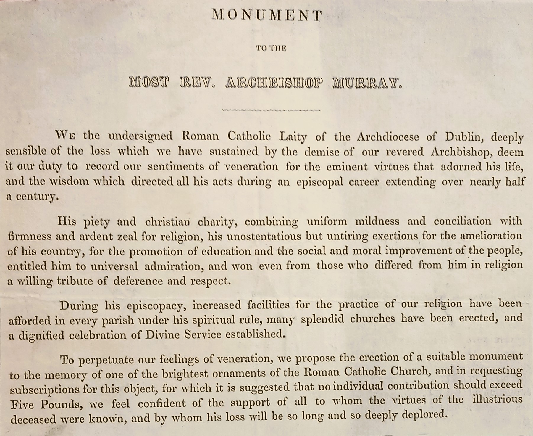 A flier seeking subscriptions for a monument to commemorate Daniel Murray (1768-1852), the late Catholic Archbishop of Dublin. (Volume page 143).