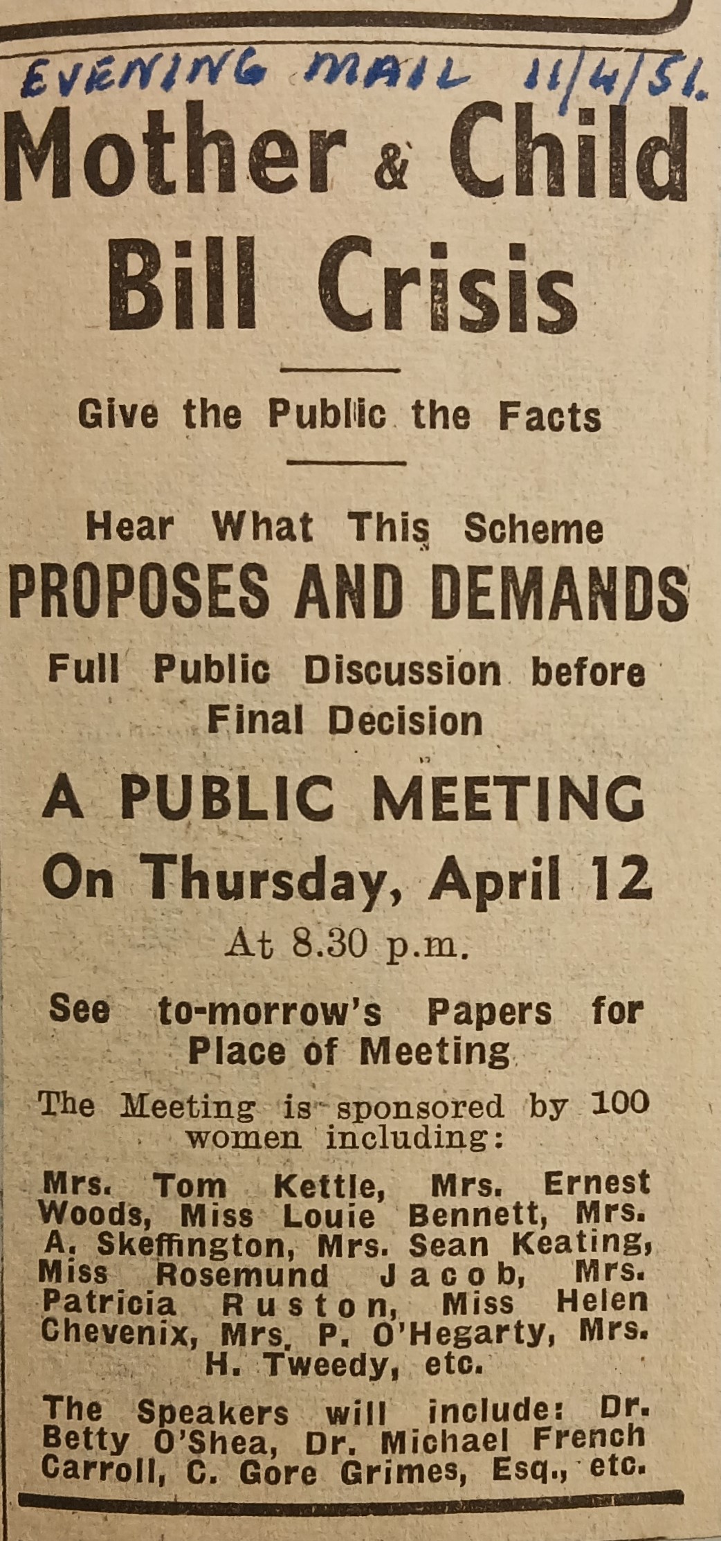 A clipping of an advertisement for a public meeting on the Mother and Child health scheme. It is noted that the meeting was sponsored by one hundred women including Louise Bennett, Rosamond Jacob, and Hilda Tweedy. The clipping is taken from the ‘Evening Mail’ (11 April 1951).